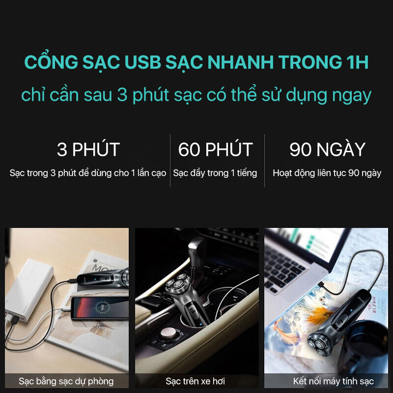 THÔNG SỐ KỸ THUẬT Tên Sản Phẩm Chất liệu: Nhựa ABS + hợp kim cao cấp Kích thước: 12x8x4.3 cm Khối lượng: 95g Thời gian sạc: 2h Dung lượng pin: 200 mAh Công suất 3W