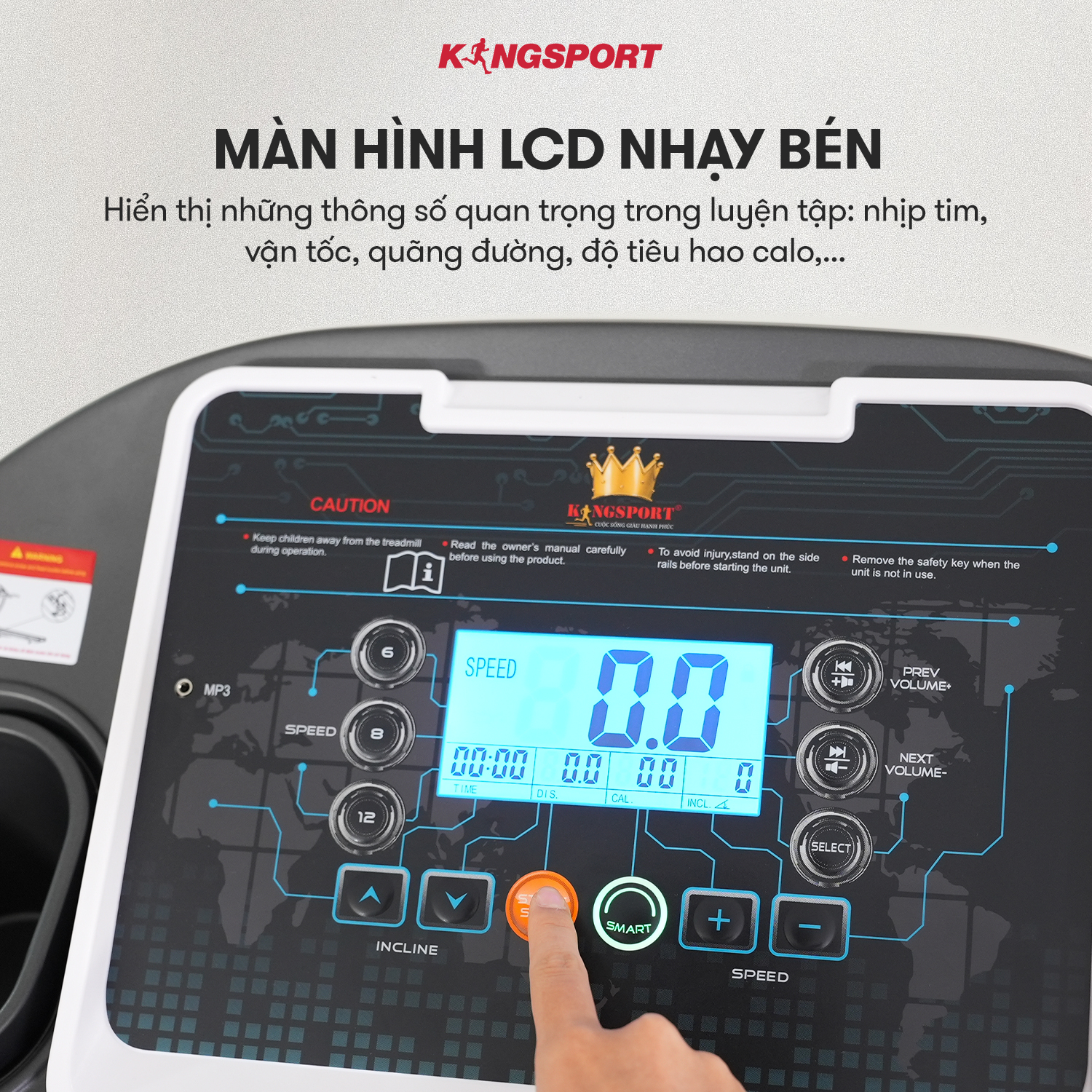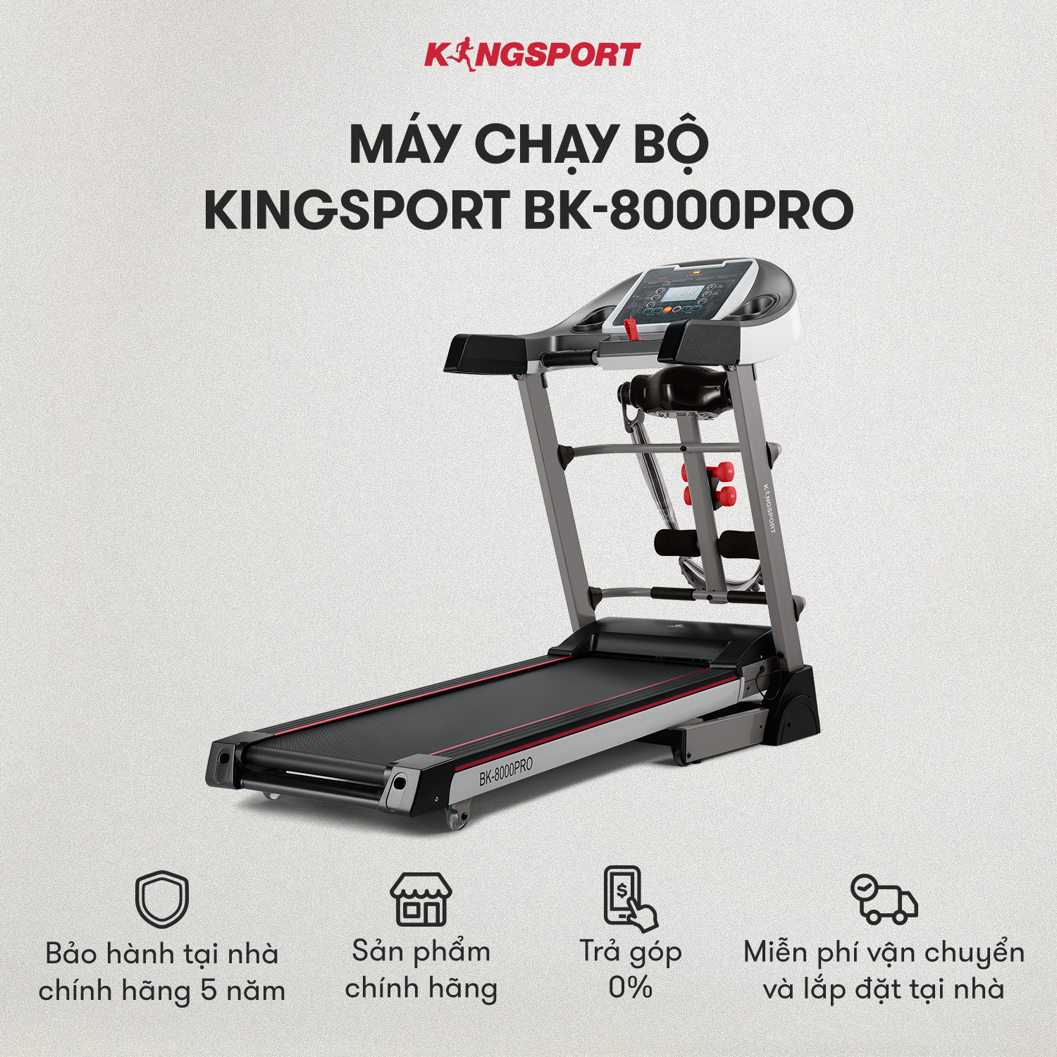 MÁY CHẠY BỘ KINGSPORT BK-8000 ĐA NĂNG - SỰ LỰA CHỌN TỐI ƯU CHO CẢ NHÀ CÙNG KHỎE ️ Thiết kế sang trọng và hiện đại phù hợp với mọi không gian ️ Khung sườn chắc chắn đảm bảo độ an toàn cao ️ Màn hình LCD hiển thị các thông số đo thời gian, quãng đường, vận tốc và calories ️ Thảm chạy Diamond nhiều lớp chống ồn và trơn trượt, rộng rãi lên đến 1260x420 mm ️ 12 chương trình luyện tập đa dạng để lựa chọn ️ Sở hữu tay cầm được tích hợp chương trình cảm biến nhịp tim ️ Tích hợp tính năng tra dầu tự động giúp máy vận hành tốt hơn ️ Động cơ mạnh mẽ và vượt trội với khả năng chạy tốc độ cao lên đến 14km/h ️ Trang bị thanh gập bụng và đai massage giúp tối ưu hiệu quả tập luyện ️ Bàn phím cơ siêu bền dễ dàng sử dụng ️ Hệ thống giảm sốc thông minh giúp giảm chấn thương trong quá trình tập ️ Nghe nhạc giải trí với âm thanh sống động: jack 3.5 và Bluetooth THÔNG SỐ KỸ THUẬT -
