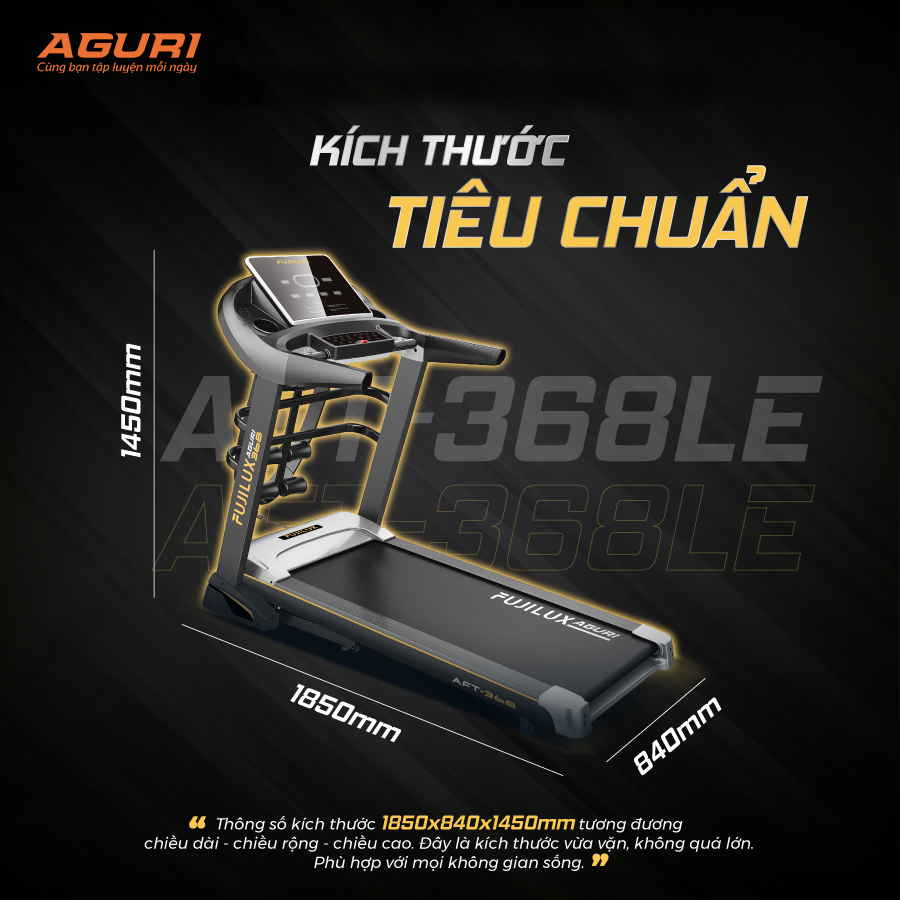 Máy chạy bộ AGURI AFT-368 - máy chạy bộ tại nhà Đây là máy chạy bộ chính hãng của thương hiệu AGURI - Máy tập của Cầu thủ Công Phượng. Là mẫu máy chạy bộ giá tốt được nhiều người tiêu dùng lựa chọn. Một mẫu máy chạy bộ gấp gọn dễ dàng, tiết kiệm không gian cho người dùng. > THÔNG SỐ KỸ THUẬT: - Motor DC công suất 4.0HP - Tốc độ: 0.8 km/h – 20.0 km/h - Chương trình mặc định: P1-P12 - Kích thước đặt máy (dài-rộng-cao): 1850*840*1450mm - Kích thước đóng thùng: 1920*900*380 mm - Diện tích băng tải: 510 x 1400 mm - Trọng lượng người dùng tối đa: 150 kgs - N.W/G.W: 103/113 kgs > MÔ TẢ SẢN PHẨM: - Màn hình LED 7 cửa sổ hiển thị thời gian, quãng đường, tốc độ, nhịp tim, độ dốc, calories, chương trình mặc định - Máy có piston thủy lực nâng đỡ, có thể gập gọn máy khi không sử dụng - Máy có 4 bánh xe di chuyển rất dễ dàng - Máy được trang bị 1 đầu massage, đánh mỡ bụng ; bộ phận gập bụng - Có hệ thống giảm sóc khi hoạt động, kết nối Bluetooth, hệ thống 2 loa stereo - Có chức năng đo chỉ số cơ thể (Body fat) > CHÍNH SÁCH BẢO HÀNH, BẢO TRÌ: - Bảo hành chi tiết máy lên tới 5 năm. Cụ thể: