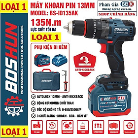 - Tên sản phẩm: Máy khoan pin BOSHUN BS-ID135AK , Anti-kickback Động cơ Không chổi than 135Nm, 13mm, 3 chức năng, Có khoá trục