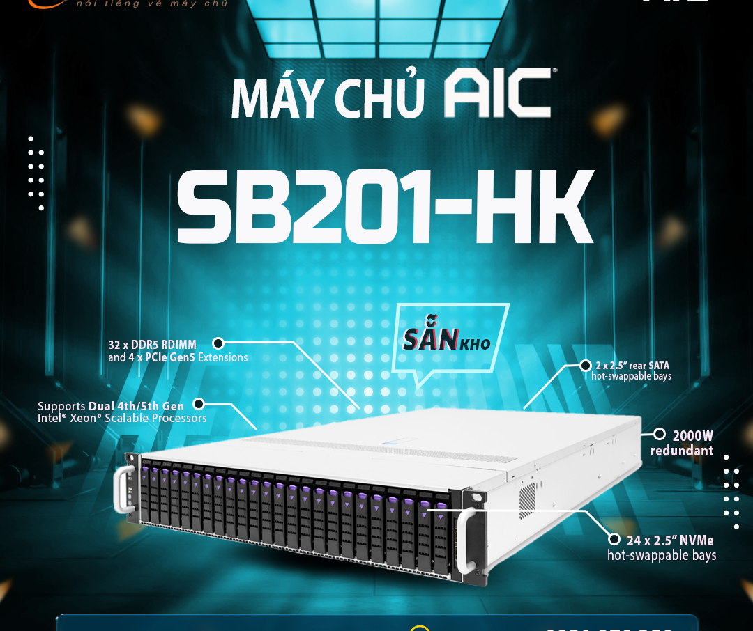 Thông tin sản phẩm Máy Chủ AIC SB201-HK SB201-HK, a 2U all flash Server solution, supports dual 4th Gen Intel Xeon Scalable Processors (codename Sapphire Rapids), 32x DDR5 RDIMM, and 4x PCIe GEN5 extensions. SB201-HK has 24