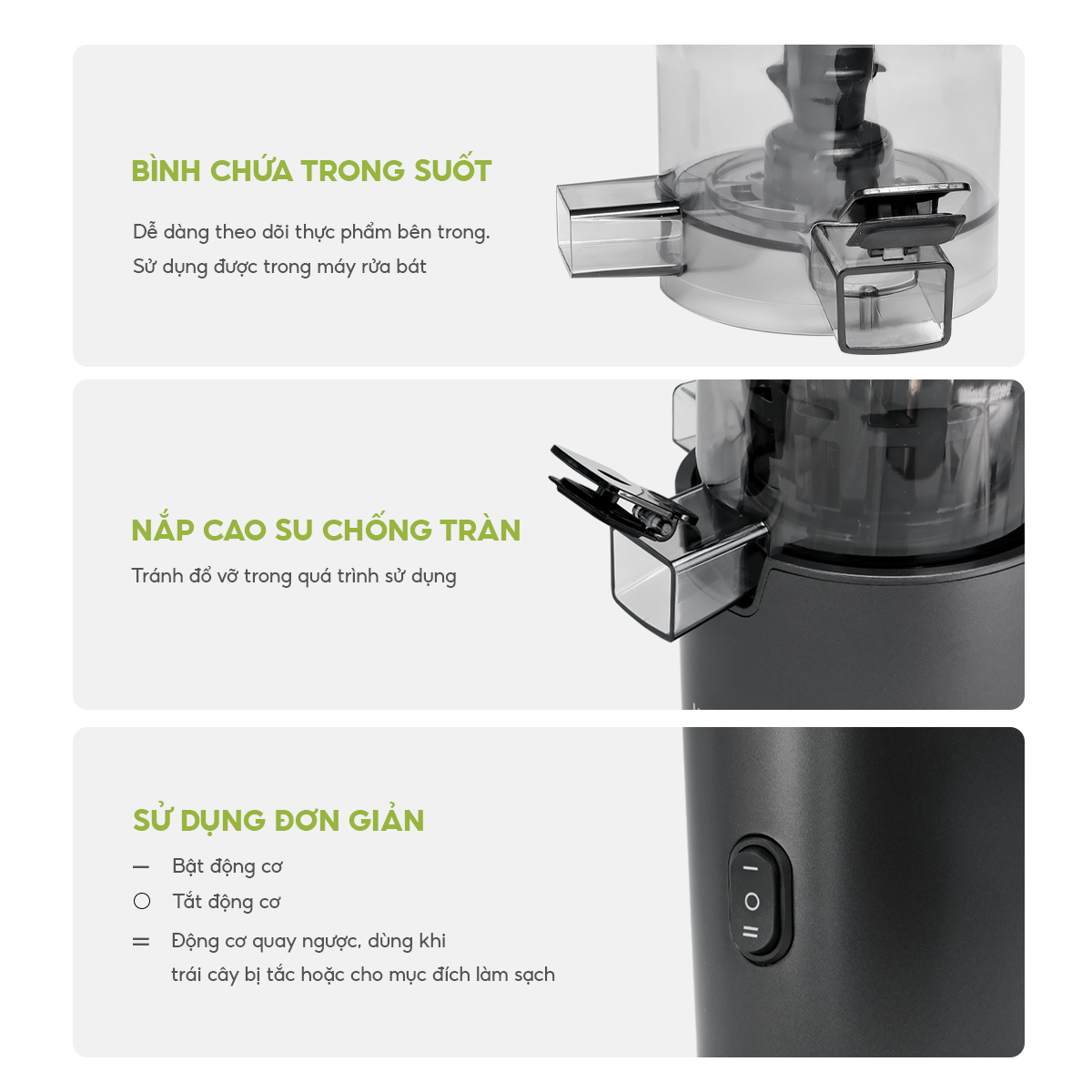 -  Thiết kế thông minh với trục ép dọc cùng trục vít đảo chiều, ép kiệt bã mọi loại trái cây, rau củ một cách dễ dàng;