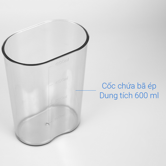 Cốc chứa nước ép và bã ép dung tích 600 ml, chứa được lượng lớn bã, nước ép đồng thời, sử dụng tiện lợi. Bên cạnh đó, máy ép còn có 1 nút công tắc điều khiển đơn giản, dễ dàng điều chỉnh.