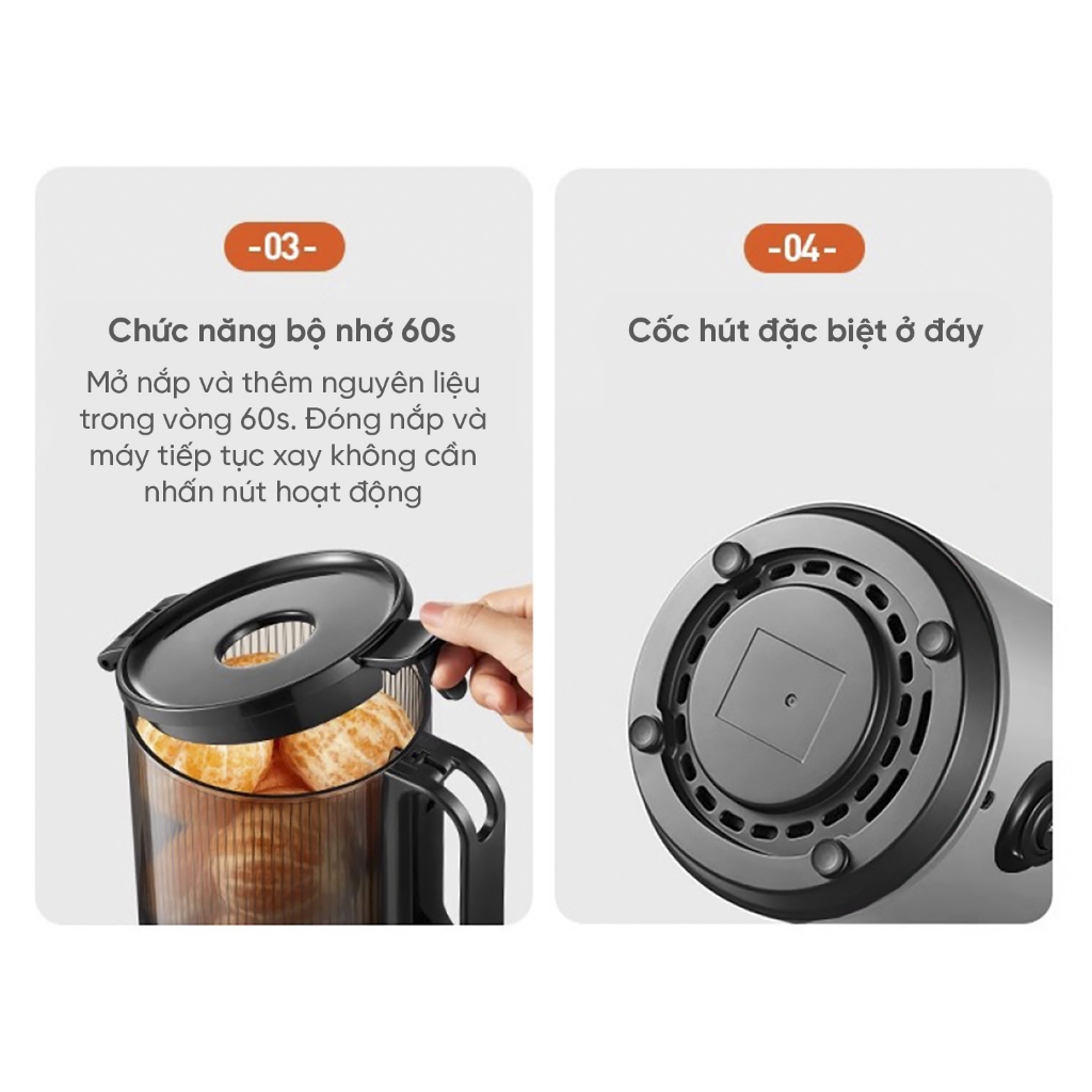 ƯU ĐIỂM SẢN PHẨM: - Động cơ bằng đồng mạnh mẽ và bền bỉ hơn - Công suất lớn 200W, áp lực mạnh mẽ giúp nghiền nát các nguyên liệu cứng -