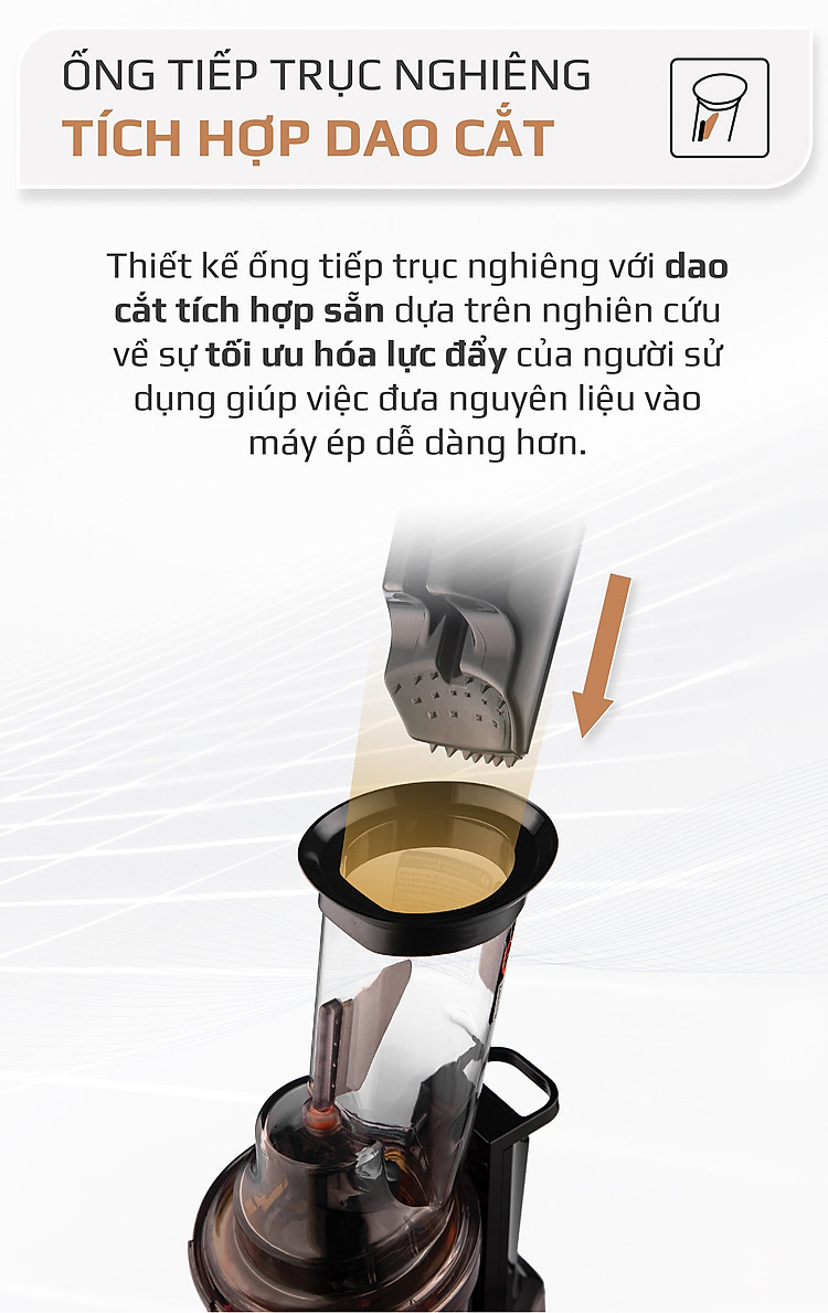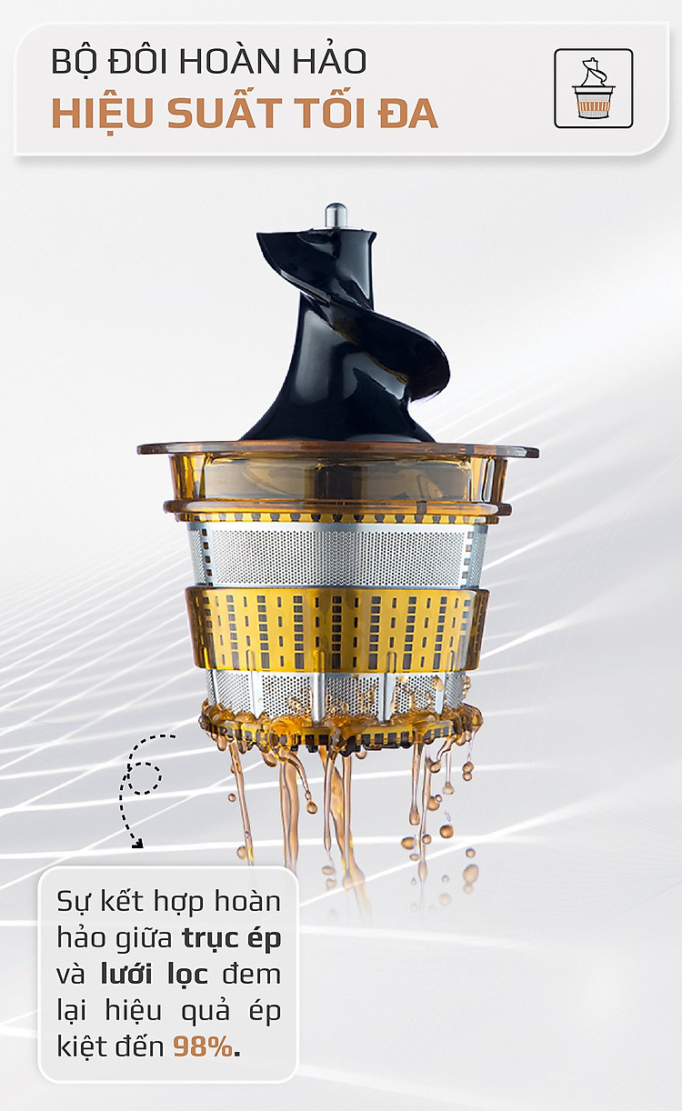 ĐẶC ĐIỂM NỔI BẬT - Công nghệ Đức - Ép kiệt bã đến 97%, mang cho bạn lượng nước ép nhiều hơn so với các loại máy thông thường - Bảo toàn toàn bộ chất