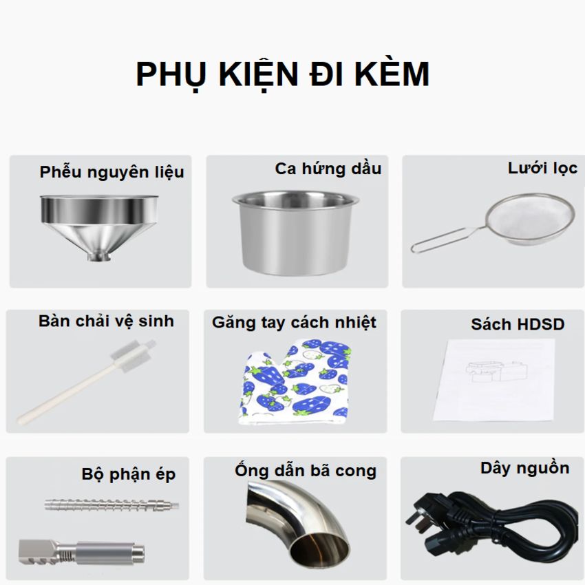 - Trọng lượng máy: 16kg * Bộ sản phẩm bao gồm: 1 thân máy, 1 ca đựng dầu ăn, 1 dây nguồn, 1 lưới lọc, 1 ống nguyên liệu, 1 găng tay và chổi vệ sinh, 1 bộ làm lệch hướng dầu, 1 sách HDSD