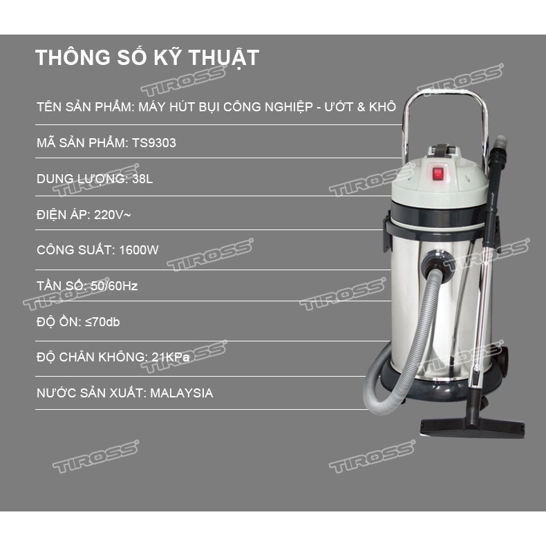Máy hút bụi công nghiệp Tiross TS9303 với dung tích lên tới 38 lít, được sản xuất tại Malaysia phù hợp cho công xưởng, kho lớn, Huy Linh phân phối và bảo hành chính hãng