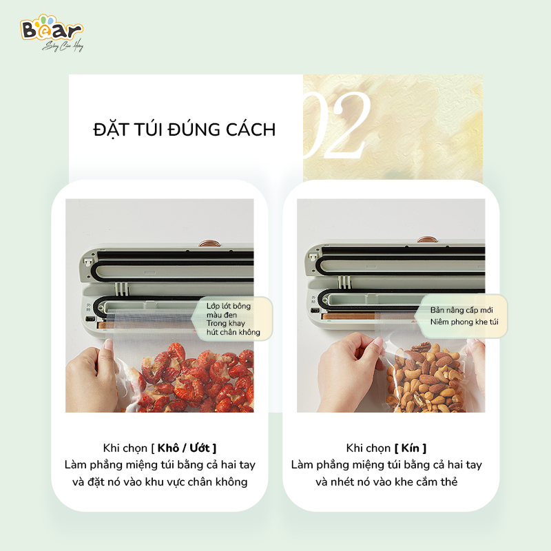 Máy hút chân không Bear 95W có thiết kế nhỏ gọn và hiện đại, trở thành thiết bị không thể thiếu trong căn bếp của nhiều gia đình Việt. Máy này có nhiều tính năng và công dụng hữu ích, mang lại sự tiện lợi cho người dùng. – Dry extraction – Hút chân không đồ khô: được sử dụng để hút và đóng kín thực phẩm không có chất lỏng như trái cây khô, thịt muối, xúc xích, trà và các loại thực phẩm khác. – Wet extraction – Hút chân không đồ ướt: được sử dụng để hút và đóng kín thực phẩm có một lượng nhỏ chất lỏng như thịt/trái cây mới rửa nhưng chưa được ráo nước, rau củ muối có thể vắt nước ra, bít tết muối và các loại thực phẩm có chất lỏng khác. – Seal – Đóng kín: được sử dụng để đóng kín miệng túi đựng thực phẩm, đồ ăn nhẹ còn dư. – Draw air out – Hút ra bên ngoài: được sử dụng để bảo quản chất lỏng hoặc nhân bánh, ngăn chặn ẩm mốc và giúp thực phẩm luôn tươi mới. – Stop – Dừng: khi máy được khởi động, chỉ cần nhấn nút dừng một lần nữa, máy sẽ ngừng hoạt động ngay lập tức. Ưu điểm nổi bật của máy hút chân không Bear 95W SB-CK95W Máy hút chân không Bear 95W SB-CK95W đã thu hút được sự quan tâm của người tiêu dùng nhờ những ưu điểm nổi bật sau đây: – Luôn giữ thực phẩm tươi ngon: Với khả năng hút mạnh lên đến 60KPA, máy hút chân không Bear 95W giúp loại bỏ không khí và vi khuẩn trong bao bì thực phẩm, giữ cho thực phẩm được bảo quản lâu hơn và giữ nguyên hương vị và chất lượng. Bạn có thể bảo quản thực phẩm hàng ngày hoặc đóng gói để mang đi xa mà không cần lo lắng. – Phù hợp với mọi loại thực phẩm: Máy hút chân không Bear 95W có 3 chế độ bảo quản phù hợp với mọi nhu cầu của người dùng cho các loại thực phẩm khô, ướt, mềm, cứng và tươi sống. Từ thịt heo, thịt bò, rau củ… tới gà rán, bánh bao, bánh trung thu… đều được bảo quản một cách sạch sẽ và an toàn. – Máy hút chân không không kén túi: Với máy này, bạn có thể sử dụng nhiều loại túi khác nhau mà không bị hạn chế. Túi chỉ cần có đường gân hoặc không có đường gân nhưng hai bên có góc gập, bạn có thể hút chân không và đóng kín. Thậm chí với túi phẳng thông thường, mặc dù không thể hút chân không nhưng bạn vẫn có thể đóng kín. – Dễ sử dụng: Các chức năng trên máy được đánh dấu rõ ràng và tương ứng với từng nút bấm hình cầu sáng bóng. Điều này giúp người dùng dễ dàng sử dụng và chọn chức năng phù hợp với nhu cầu của mình. Trong quá trình sử dụng, bạn không cần áp lực mạnh mà chỉ cần nhẹ nhàng bấm là đã hoàn thành việc hút chân không. – Thiết kế thông minh: Máy hút chân không Bear 95W có màn hình kỹ thuật số hiển thị giá trị hút chân không cụ thể, giúp bạn dễ dàng quan sát. Vòng đóng kín mềm giúp tăng cường hoạt động ổn định của máy. Ngoài ra, máy còn có đế chống trượt để đảm bảo sự ổn định, chắc chắn và hạn chế sự di chuyển trong quá trình hút. – Kiểu dáng đẹp mắt: Máy hút chân không Bear có vẻ ngoài đẹp mắt, thu hút mọi ánh nhìn. Màu xanh bạc hà kết hợp với màu vàng nhạt tạo nên không khí đồng quê mang phong cách Anh Quốc cổ điển. Hướng dẫn sử dụng máy hút chân không Bear 95W SB-CK95W Cách sử dụng máy hút chân không Bear khá đơn giản. Bạn chỉ cần làm theo các bước sau đây là đã có thể bảo quản thực phẩm một cách nhanh chóng. Hút chân không thực phẩm khô – Bước 1: Đặt máy trên một bề mặt phẳng, kết nối nguồn điện, đặt thực phẩm vào túi hút chân không, làm phẳng miệng túi hút chân không, sau đó đặt vào khay hút chân không. – Bước 2: Nhấn xuống công tắc tự khoá của nắp đậy với cả hai tay và khóa máy sao cho phát ra âm thanh “click”. Chọn nút “Dry extraction” để máy bắt đầu hút và đóng kín tự động. – Bước 3: Sau khi đèn đỏ tắt hoàn toàn, quá trình đóng kín tự động kết thúc. Nhấn nút giảm áp suất để mở nắp đậy. (Nếu nút giảm áp không mở bằng cách nhấn xuống, hãy nhấn từ hai bên bằng hai tay để mở khoá). Hút chân không thực phẩm ướt – Bước 1: Đặt thực phẩm vào túi hút chân không, làm phẳng miệng túi hút chân không, sau đó đặt vào khay hút chân không. – Bước 2: Nhấn xuống công tắc tự khóa của nắp đậy với cả hai tay và khóa máy sao cho phát ra âm thanh “click”. Chọn nút “Wet extraction” để máy bắt đầu hút chân không và đóng kín tự động. – Bước 3: Sau khi đèn đỏ tắt hoàn toàn, quá trình đóng kín tự động kết thúc. Nhấn công tắc giảm áp suất để mở nắp đậy. (Nếu nút giảm áp không mở bằng cách nhấn xuống, hãy nhấn từ hai bên bằng hai tay để mở khoá). Đóng kín – Bước 1: Đặt thực phẩm vào túi hút chân không, làm phẳng miệng túi hút chân không, sau đó đặt vào khay hút chân không. – Bước 2: Nhấn xuống công tắc tự khóa nắp đậy với cả hai tay và khóa máy sao cho phát ra âm thanh “click”. N