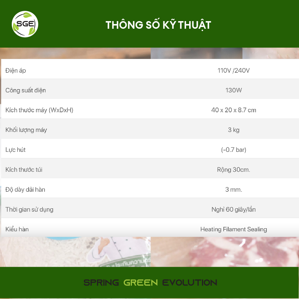 - Tên sản phẩm: Máy hút chân không thực phẩm Vacuum Selaer - Xuất xứ: Trung Quốc Nội Địa - Điện áp: 110V/60Hz - 220V/50Hz - Công xuất: 100W. - Công suất hút: -45Kpa/-60Kpa -