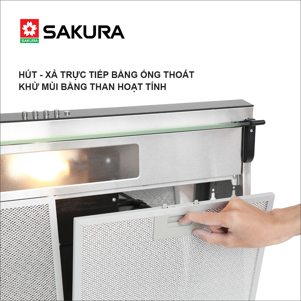 -Máy hút khói SAKURA, treo tủ kệ -Hút - xả trực tiếp bằng ống thoát -Khử mùi bằng than hoạt tính -Thân máy inox -2 motor, 3 nấc tốc độ, 1 đèn chiếu sáng -Lưới