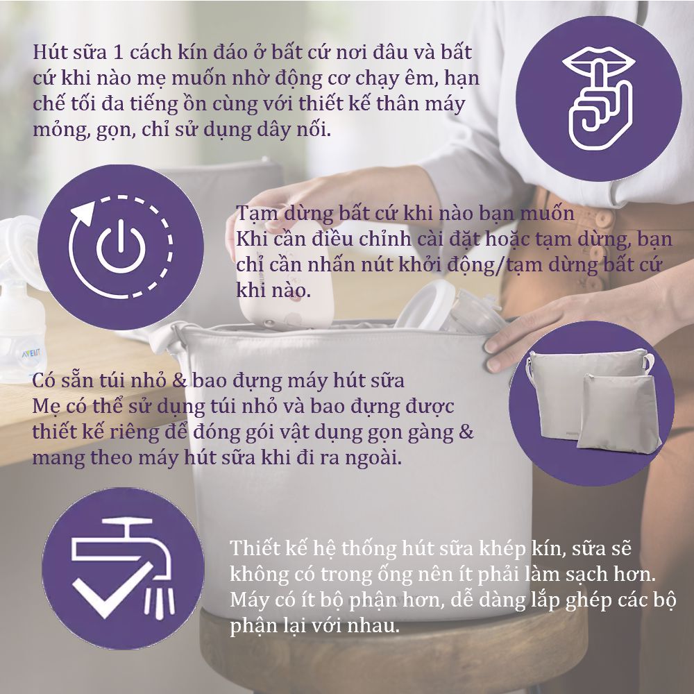 Hoạt động êm ái,dễ dàng hút sữa vào ban đêm mà không lo ngại làm bé tỉnh giấc. hút sữa 2 pha và 9 mức cường độ đáp ứng mọi nhu cầu của người dùng.