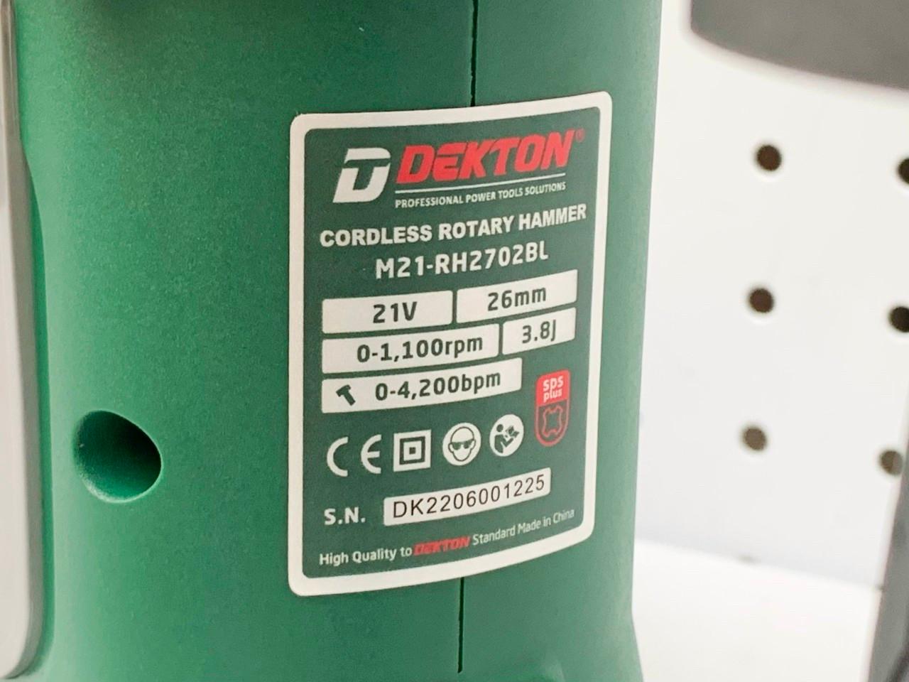 Thông số kỹ thuật -Chỉ gồm thân máy -Mã sản phẩm: M21-RH2702BL -Thương hiệu: Dekton -Điện Áp :18 -21V chân pin phổ thông Makita -Đầu cặp SDS PLUS / Khoan bê tông tối đa mũi 26mm -Vòng Tua 0 - 1100Rpm -Lực đập 3.8J -Nhịp búa 0-4200Bpm -Bảo hành 6 tháng