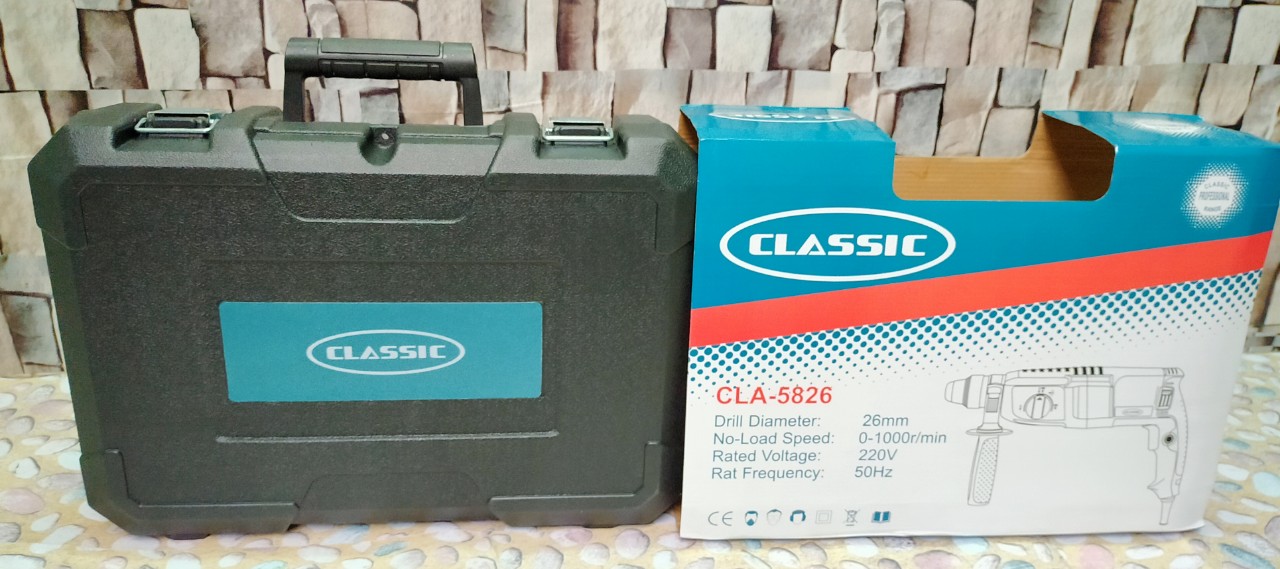 -Trọng lượng máy khoan búa là 3.4kg, trọng lượng cả bao bì là 5.1kg. Máy khoan Classic CLA 5826 đi kèm hộp đựng nhựa, kèm 5 mũi khoan giúp bạn có thể khoan bê tông với đường kính tối đa là 26mm.