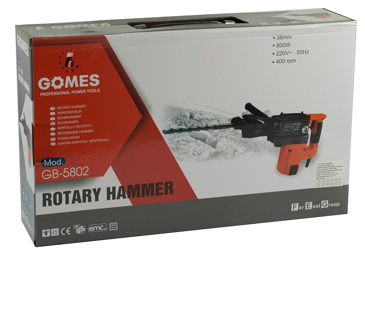 Thông Số Kỹ Thuật: -Máy đục bê tông Gomes GB-5802 (38mm) -Hãng sản xuất:GOMES -Công suất: 850W -Nguồn điện :220V-240V/50-60hz -Tốc độ không tải: 700 vòng / phút -Tốc độ búa:2900 lần /phút -Khả năng đục:38mm (Bê tông Max)