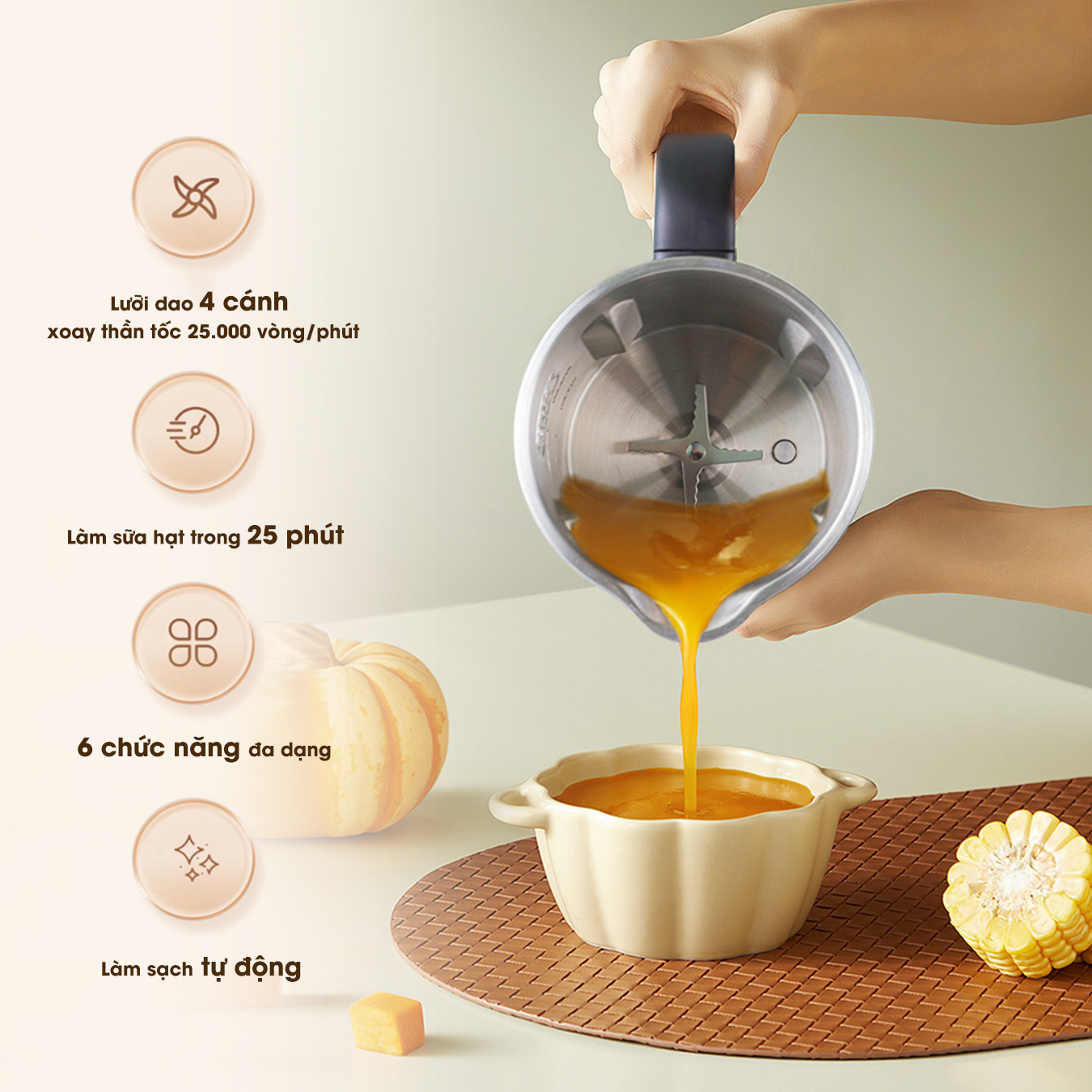Loại sản phẩm : Máy làm sữa hạt Tính năng sản phẩm : Làm sữa hạt, sữa đậu nành. Nấu cháo, nâu súp. Nấu bột cho bé ăn dặm. Xay hạt, xay đồ khô, xay