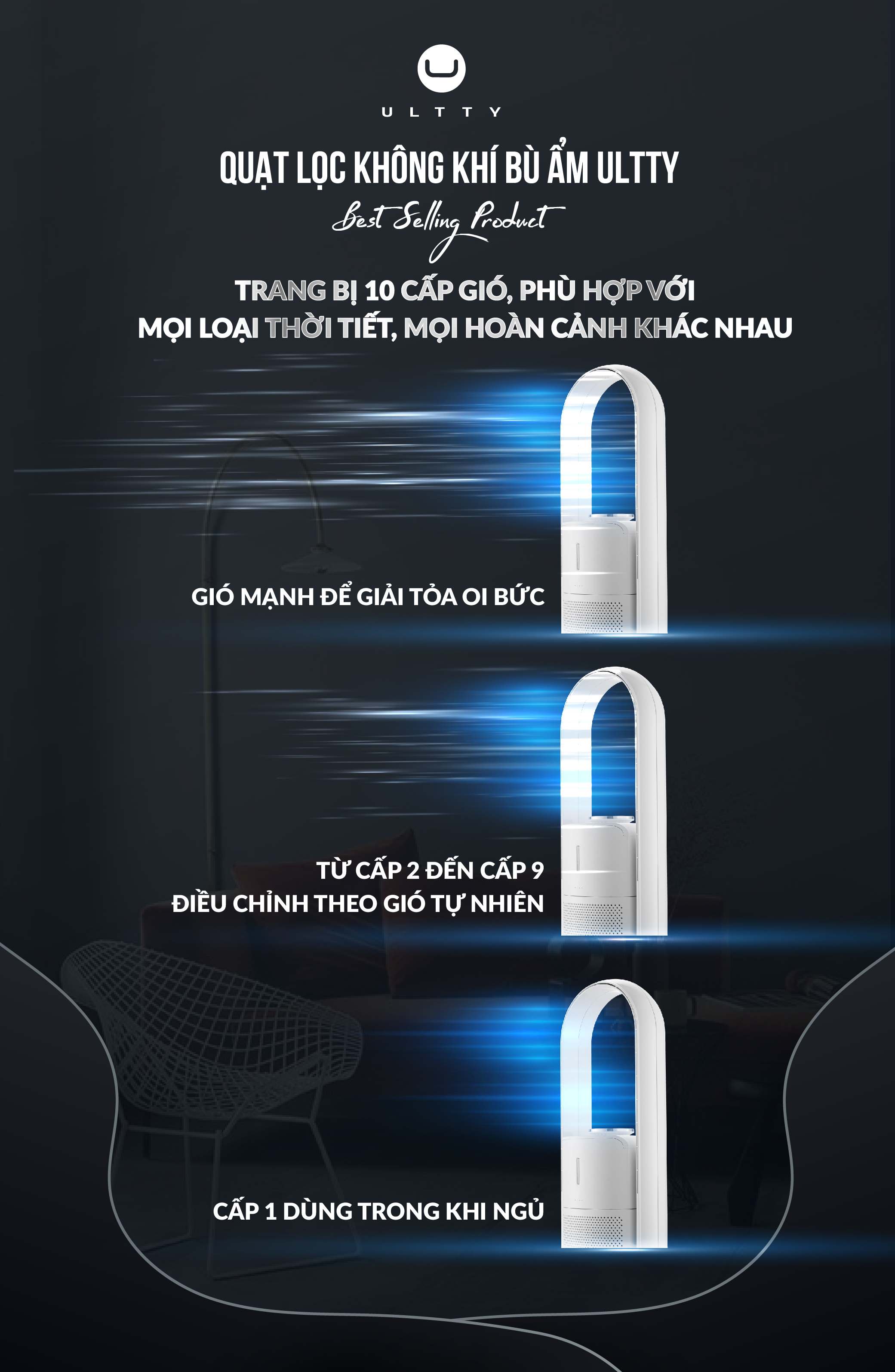 - Tăng áp tua bin, bội khí, tản nhiệt 4D, kết hợp cùng động cơ DC không chổi than mạnh mẽ, quạt lọc bù ẩm Ultty tạo ra tốc độ gió lên tới 4,5 m/s (tương đương 16,2 km/h), cao nhất trong các dòng quạt không cánh hiện nay. Gió thổi ra mềm mại tinh tế như gió tự nhiên, có thể thổi xa đến 8m, bạn sẽ không cảm nhận được sự va đập khó chịu của gió lên thân thể như quạt truyền thống