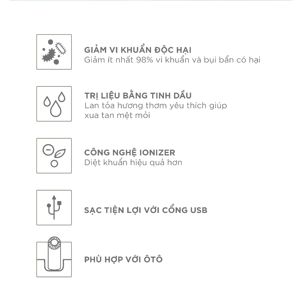 - oại bỏ 99,97% chất gây ô nhiễm trong không khí như vi rút, sol khí, khói và hơn thế nữa - Lọc không khí cho các phòng có diện tích lên đến 59 m²