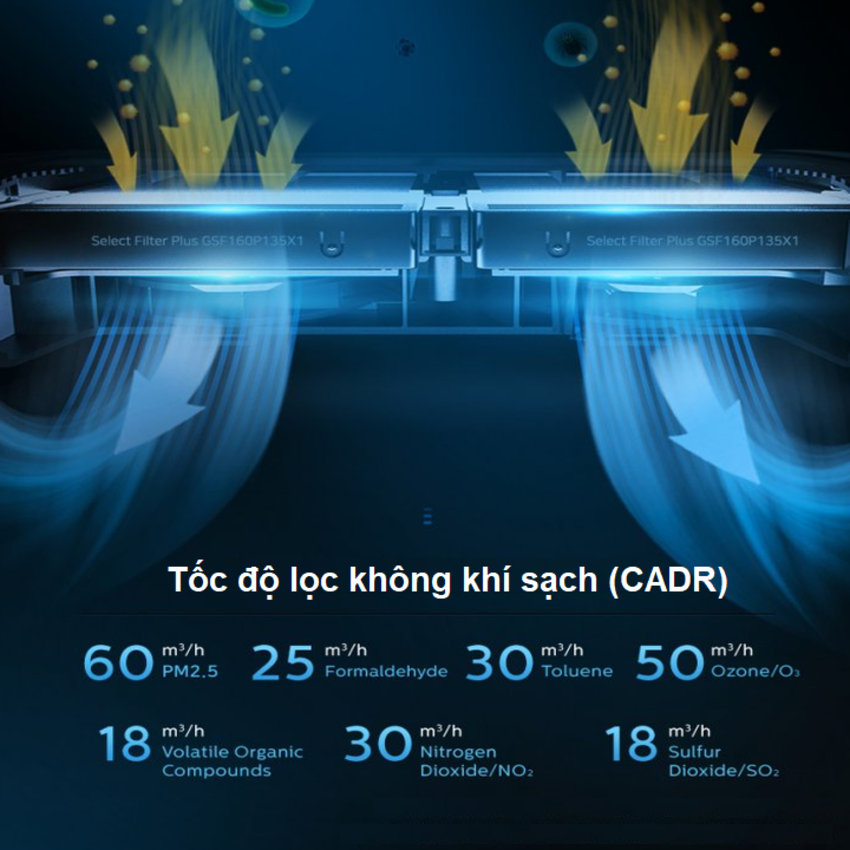 - Lọc PM2.5: CADR 60 m3 / giờ