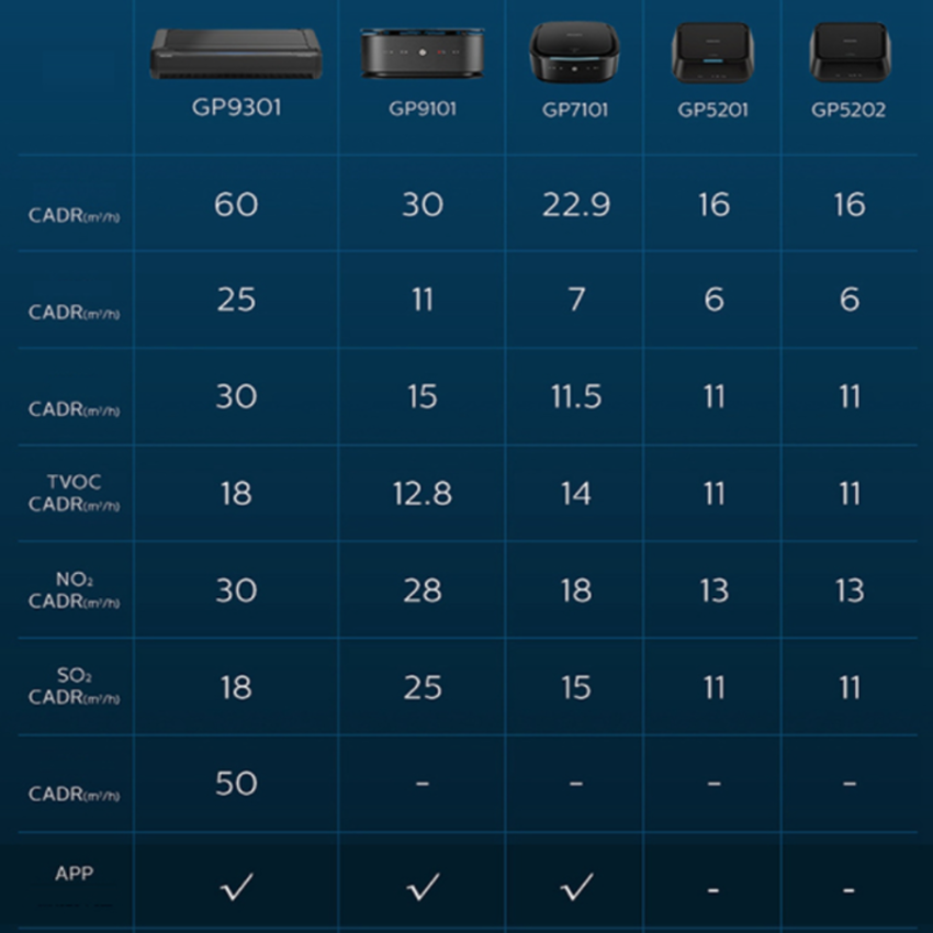 - Với Tỷ lệ lọc không khí sạch (CADR) là 60m3 / giờ cho PM2.5, máy sẽ lọc sạch 50% lượng khí thải của một chiếc sedan hoặc SUV tiêu chuẩn trong 2 phút. Bộ lọc mạnh mẽ này cũng loại bỏ khói, bụi và các hạt bụi siêu mịn PM1 xuống 0,01µm
