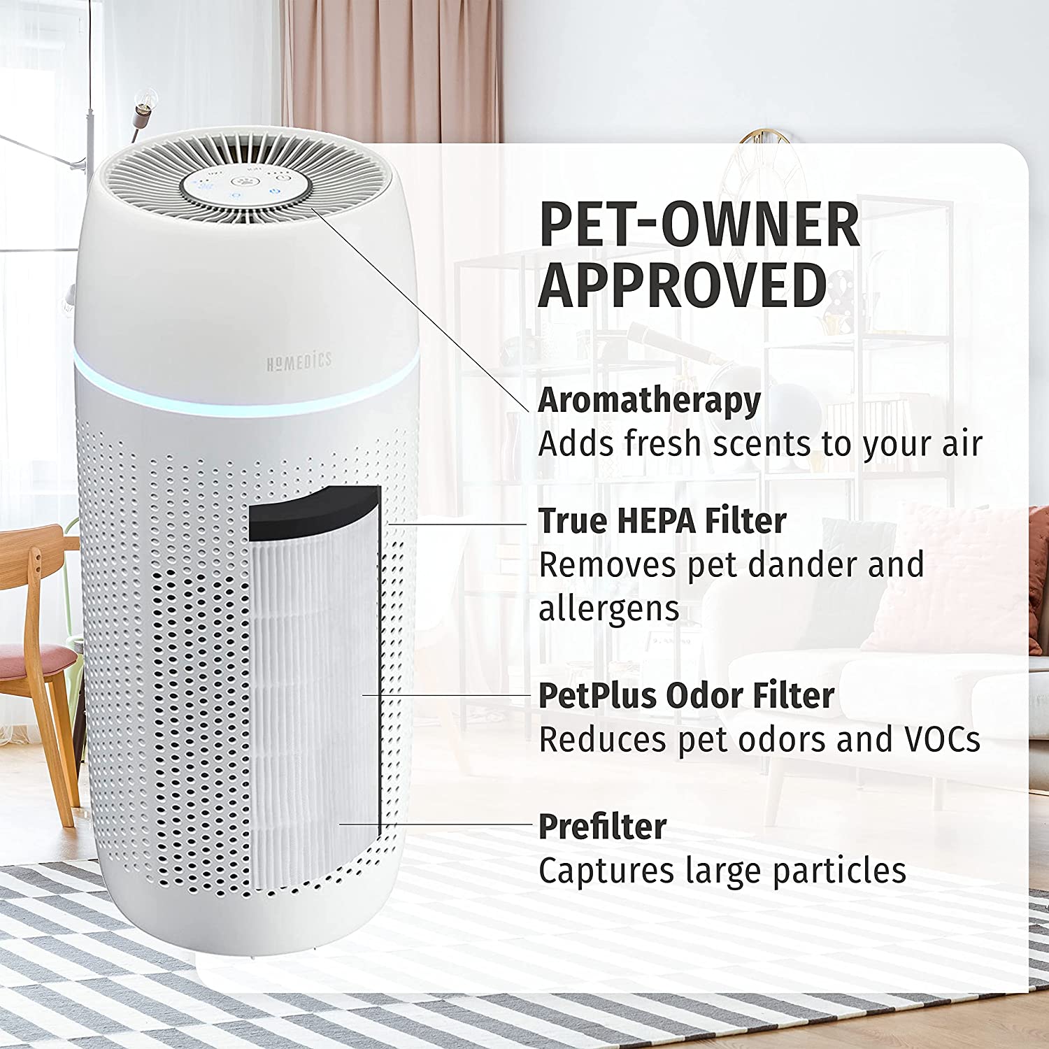 HoMedics AP-PET35A-WT một chiếc máy lọc không khí chuyên dụng cho những gia đình có vật nuôi. Bộ lọc của thiết bị này có thêm một lớp màng lọc chuyên dụng để loại bỏ lông thú cưng, mùi hộp rác, mùi lông hoặc phân động vật. 5 tính năng độc đáo được tích hợp trên chiếc máy lọc không khí cỡ lớn này.