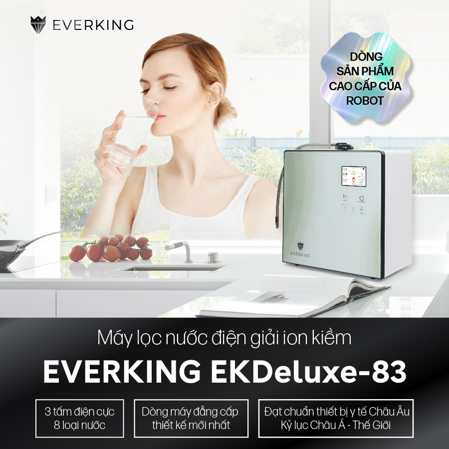 - Nước lọc trung tính pH 7.0 Chất lượng nước đạt chỉ số tối ưu, nồng độ Hydro hoạt tính lên đến ~ 350 -> 600 ppb, chống oxy hóa (ORP) lên đến ~ -300 -> -450 mV, chỉ số lý tưởng của máy lọc nước điện giải ion kiềm, được kiểm nghiệm trực tiếp tại Phòng Thí Nghiệm chuyên nghiệp cấp quốc gia. Chỉ số Hydrogen, ORP của nước tùy thuộc số tấm điện cực, đặc tính nguồn nước & “điều kiện đo trong phòng thí nghiệm chuyên nghiệp, đạt chuẩn”. Công nghệ vi điều khiển RMC/LCD tiên tiến, khác biệt vượt trội: Đỉnh cao công nghệ điện phân Korea Hệ thống đa cấp lọc hoàn hảo EVERKING EKDeluxe-83 được tích hợp công nghệ UF tiên tiến lọc nước trung tính, với hệ thống lọc đa cấp sản xuất Hàn Quốc & công nghệ diệt khuẩn Nano Carbon (ROBOT) vẫn “giữ được các khoáng chất tự nhiên của nước cho quá trình điện phân tạo nước điện giải bền vững 24/24 suốt vòng đời của máy”. Kiểu dáng hiện đại thiết kế thông minh Máy lọc nước điện giải EVERKING EKDeluxe-83 có kiểu dáng mới nhất, để bàn hoặc treo tường, có nhiều tính năng độc đáo, tiện ích sử dụng duy nhất thị trường - phù hợp mọi không gian như nhà bếp, phòng ăn, phòng khách, văn phòng, Với sắc màu xanh trắng cẩm thạch chủ đạo, sản phẩm tạo nên cảm giác sang trọng, thư thái và đẳng cấp cho người sử dụng. Giá thành phải chăng cho mọi nhà Nếu so sánh với các sản phẩm nhập khẩu EVERKING EKDeluxe-83 có chất lượng vượt trội, đạt chuẩn quốc tế, nhưng giá thành siêu tiết kiệm. Đặc biệt, chi phí thay lõi lọc cũng luôn được nhà sản xuất đảm bảo trong mức dưới 2.000.000đ/năm. Kết hợp chế độ bảo hành chính hãng, luôn sẵn có vật tư linh kiện thay thế nhanh chóng với mức phí ưu đãi nhất. CHỨNG NHẬN CHẤT LƯỢNG EVERKING EKDeluxe-83 đạt các chứng nhận cấp quốc tế, Thiết bị Y Tế & An Toàn Điện Châu Âu CE, đăng ký FDA, Đĩa Vàng Sáng Tạo Thế Giới, đăng ký bản quyền sáng chế tại Quốc Tế.