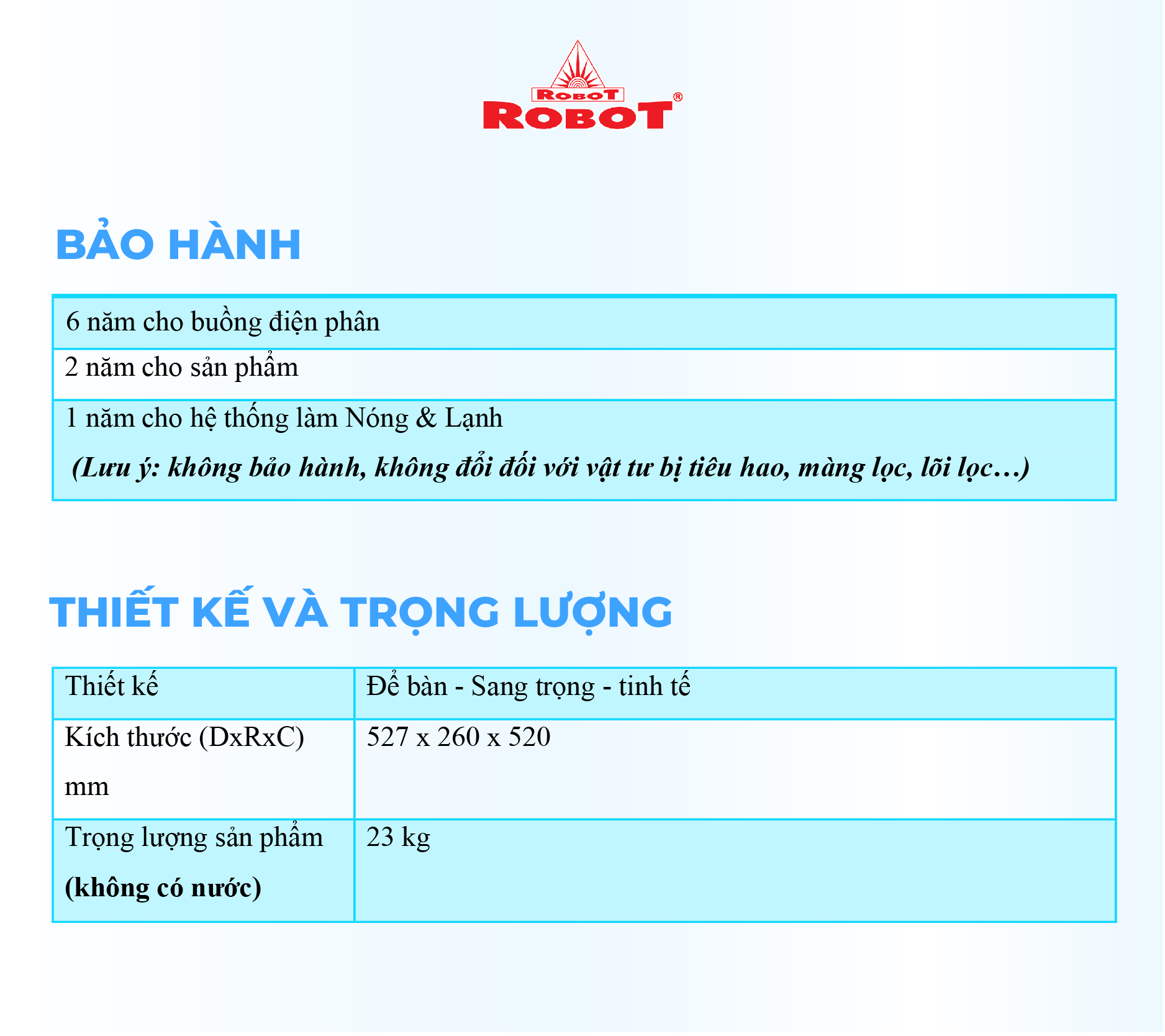 Tổng quan - Kiểu lắp đặt:Tủ đứng - Loại máy:Máy lọc nước RO nóng nguội lạnh - Công nghệ lọc:Thẩm thấu ngược RO - Kháng khuẩn:Nano Silver - Dung tích bình chứa:Tổng 7.8 lít (Nước nóng 0.8 lít, nước lạnh 1 lít, nước thường 6 lít) - Tỷ lệ lọc - thải:Lọc 4.8 - Thải 5.2 (Tỷ lệ này phụ thuộc vào chất lượng nước đầu vào) - Công suất lọc:18 lít/giờ - Công suất tiêu thụ điện trung bình khoảng:0.628 kW/h - Nhiệt độ nước hãng công bố:Nóng 80 - 90°C, Lạnh 10°C - Nhiệt độ nước thực tế:Nóng 80 - 90°C, Lạnh 10°C - Áp lực nước yêu cầu:0.07 - 0.25 MPa - Nơi sản xuất máy bơm:Trung Quốc - Năm ra mắt:2023 - Thương hiệu:Việt Nam - Nơi sản xuất:Việt Nam Thông tin lõi lọc - Số lõi lọc:10 lõi -
