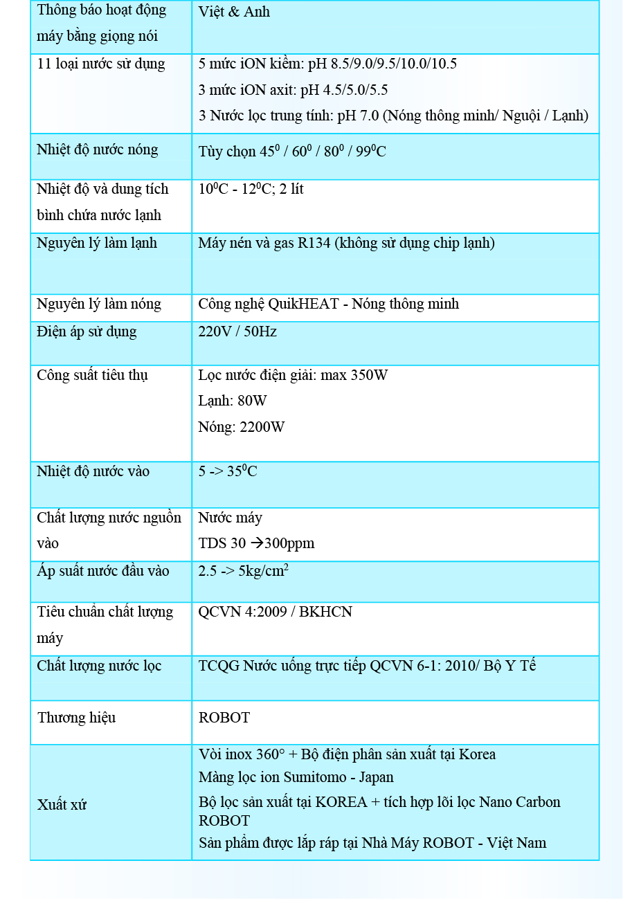 - Và 3 mức nước iON axit (pH 4.5/5.0/5.5). Chất lượng nước đạt chỉ số tối ưu, nồng độ Hydro hoạt tính lên đến ~ 800 -> 950 ppb, chống oxy hóa (ORP) lên đến ~ -400 -> -600 mV, đáp ứng mọi nhu cầu sử dụng trong cuộc sống. Máy lọc nước điện giải iON kiềm Nóng Lạnh ROBOT ionQueen là dòng Để Bàn đầu tiên trên thế giới, được thiết kế kiểu dáng hiện đại, thiết kế chinh phục mọi không gian. Đặc biệt, được tích hợp thêm chức năng Nóng Thông Minh – Lạnh độc đáo & duy nhất trên thị trường, mang lại nhiều tiện ích cho người dùng. Chỉ số Hydrogen, ORP của nước tùy thuộc số tấm điện cực, đặc tính nguồn nước & “điều kiện đo trong phòng thí nghiệm chuyên nghiệp, đạt chuẩn”. Máy lọc nước điện giải iON kiềm Nóng Lạnh ROBOT ionQueen 711, tạo 11 loại nước bổ ích, pH 4.5 ---> 10.5 - Đáp ứng mọi nhu cầu trong cuộc sống Có thể tham khảo ý kiến của Bác sĩ hoặc chuyên gia dinh dưỡng để được hướng dẫn loại nước uống phù hợp nhất cho cơ thể. Kiểu dáng hiện đại - Thiết kế chinh phục mọi không gian ● Kiểu dáng để bàn, khác biệt so với các dòng điện giải khác ● Sử dụng linh hoạt cho mọi không gian ● Vòi nước điện giải xoay 360° ● Hệ thống điều khiển cảm ứng trên mặt phủ kính với màn hình LCD tinh tế Với mong muốn nhiều gia đình Việt có thể sử dụng nước điện giải iON kiềm với chi phí hợp lý để bảo vệ sức khỏe, sắc đẹp & nâng cao chất lượng cuộc sống, ROBOT mang đến sản phẩm “Chất lượng Quốc tế - Giá thành Việt Nam”, phù hợp với mức sống của nhiều người. Tiết kiệm cho người tiêu dùng đến hơn một nửa chí phí so với máy nhập khẩu chỉ từ 30 – 50%, nhưng sở hữu nhiều ưu điểm, tính năng vượt trội, chất lượng cao. Chế độ bảo hành chính hãng, tận nơi, vật tư và linh kiện, lõi lọc luôn có sẵn hạn chế tối đa chi phí sửa chữa, bảo trì. VĐV Cầu Lông Nguyễn Tiến Minh – tay vợt từng đứng Top 5 Thế Giới chia sẻ: Sau một thời gian sử dụng Máy lọc nước điện giải iON kiềm Minh thấy cải thiện sức khỏe rất nhiều và tốc độ hồi phục sau tập luyện, thi đấu cũng nhanh hơn so với trước đây. Bây giờ mỗi khi đi tập, hay khi đi thi đấu, Minh đều mang theo nước iON kiềm để uống. ROBOT là một thương hiệu Việt Nam uy tín nên Minh hoàn toàn tin tưởng và lựa chọn Máy lọc nước điện giải iON kiềm ROBOT. ️Thông Tin Thương Hiệu CÔNG TY CỔ PHẦN ĐẦU TƯ ROBOT