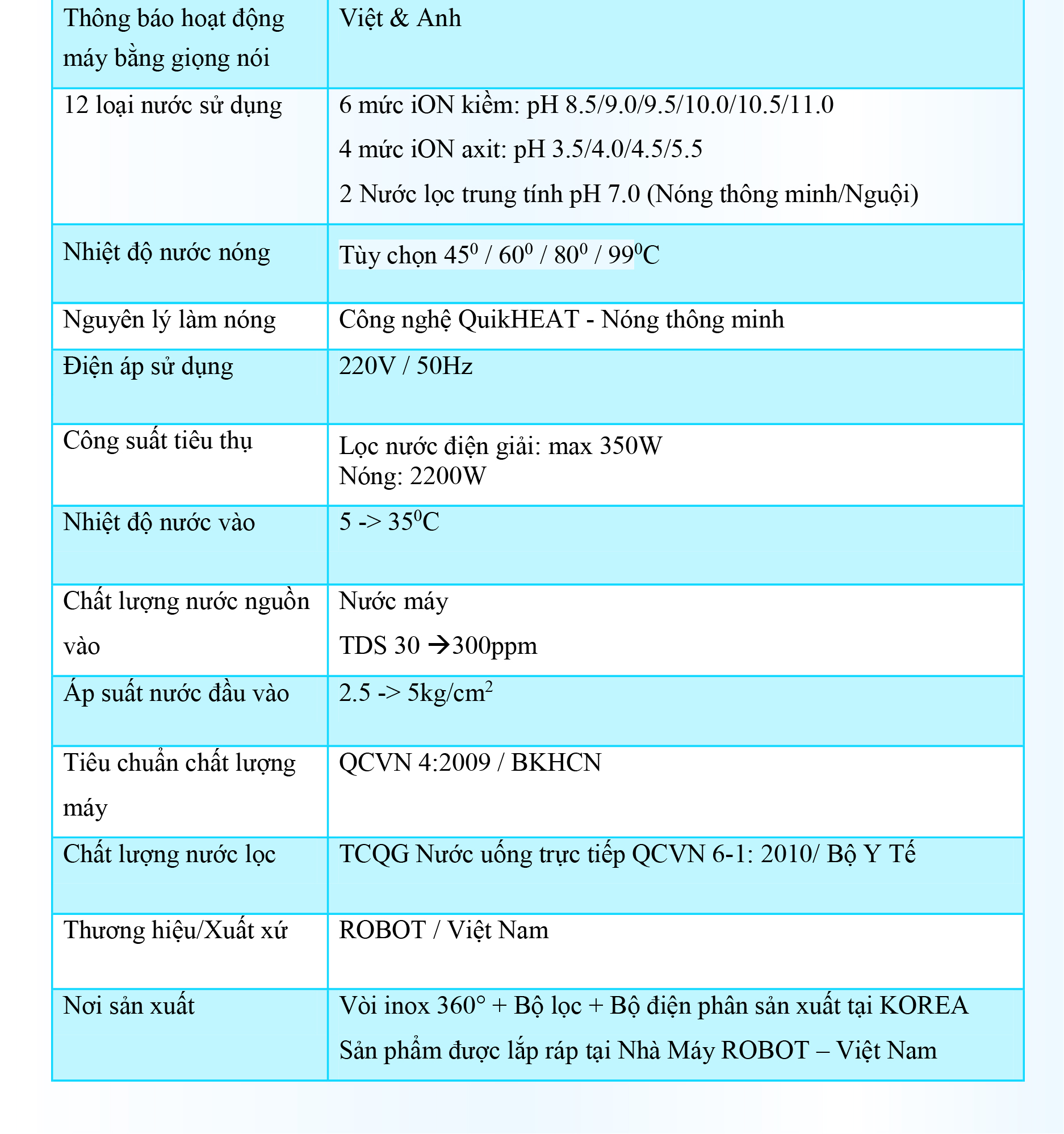 - ️ Máy lọc nước điện giải iON kiềm Nóng ROBOT ionSmart được thiết kế kiểu dáng hiện đại, thiết kế chinh phục mọi không gian. Đặc biệt, bộ sưu tập 5 sắc màu pastel hiện đại đáp ứng mọi sở thích và phong cách nội thất, chắc chắn sản phẩm sẽ là điểm nhấn đặc sắc trong ngôi nhà của bạn. ️ Máy lọc nước điện giải iON kiềm Nóng ROBOT ionSmart 1112, tạo 12 loại nước bổ ích, pH từ 3.5 --> 11.0 - Đáp ứng mọi nhu cầu trong cuộc sống