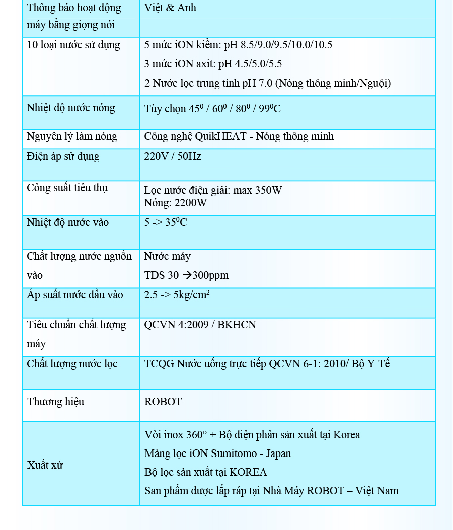 - Và 3 mức nước iON axit (pH 4.5/5.0/5.5). Chất lượng nước đạt chỉ số tối ưu, nồng độ Hydro hoạt tính lên đến ~ 800 -> 950 ppb, chống oxy hóa (ORP) lên đến ~ -400 -> -600 mV, đáp ứng mọi nhu cầu sử dụng trong cuộc sống. Máy lọc nước điện giải iON kiềm Nóng ROBOT ionSmart được thiết kế kiểu dáng hiện đại, thiết kế chinh phục mọi không gian. Đặc biệt, bộ sưu tập 5 sắc màu pastel hiện đại đáp ứng mọi sở thích và phong cách nội thất, chắc chắn sản phẩm sẽ là điểm nhấn đặc sắc trong ngôi nhà của bạn. Chỉ số Hydrogen, ORP của nước tùy thuộc số tấm điện cực, đặc tính nguồn nước & “điều kiện đo trong phòng thí nghiệm chuyên nghiệp, đạt chuẩn”. ️ Máy lọc nước điện giải iON kiềm Nóng ROBOT ionSmart 710, tạo 10 loại nước bổ ích, pH 4.5 --> 10.5 - Đáp ứng mọi nhu cầu trong cuộc sống Có thể tham khảo ý kiến của Bác sĩ hoặc chuyên gia dinh dưỡng để được hướng dẫn loại nước uống phù hợp nhất cho cơ thể. Kiểu dáng hiện đại - Thiết kế chinh phục mọi không gian