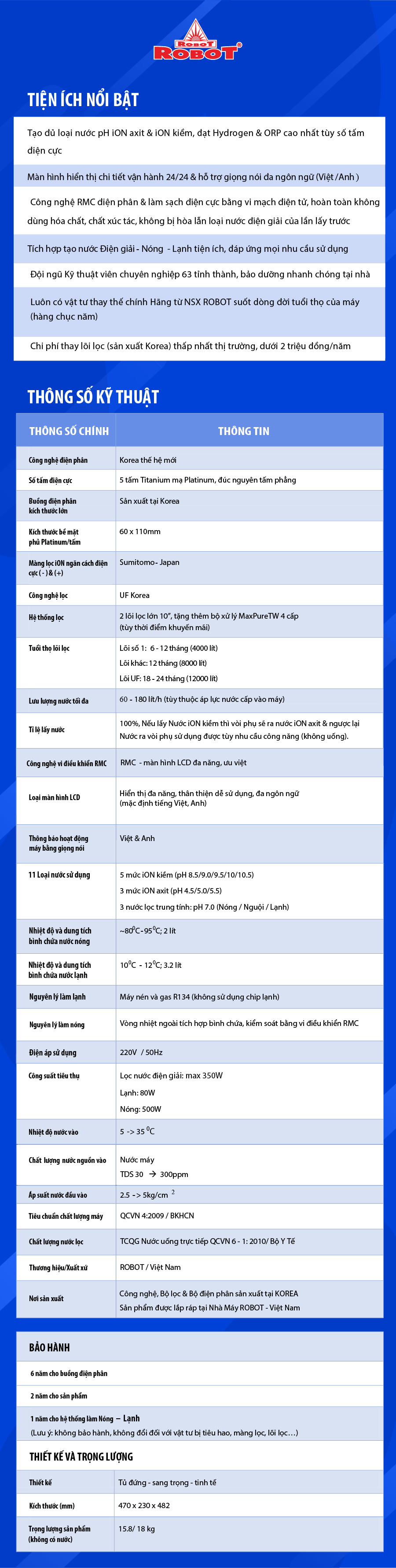 Máy lọc nước điện giải iON kiềm ROBOT UHC 4511 là model đặc biệt sản xuất với công nghệ tiên tiến hàng đầu thế giới, trang bị 5 tấm điện cực lớn nhất, có khả năng tạo ra đến 11 loại nước đa chức năng, với 5 mức nước iON kiềm (pH 8.5 - 10.5), nước lọc trung tính - Nóng - Lạnh (pH 7.0) & 3 mức nước iON axit (pH 4.5 - 5.5), có thể điều chỉnh, thay đổi tùy theo đặc tính nguồn nước tại nơi lắp đặt. Với nồng độ Hydro hoạt tính lên đến ~750 -> 850 ppb, chống oxy hóa (ORP) lên đến ~-350 -> -500 mV, đáp ứng mọi nhu cầu sử dụng trong cuộc sống.
