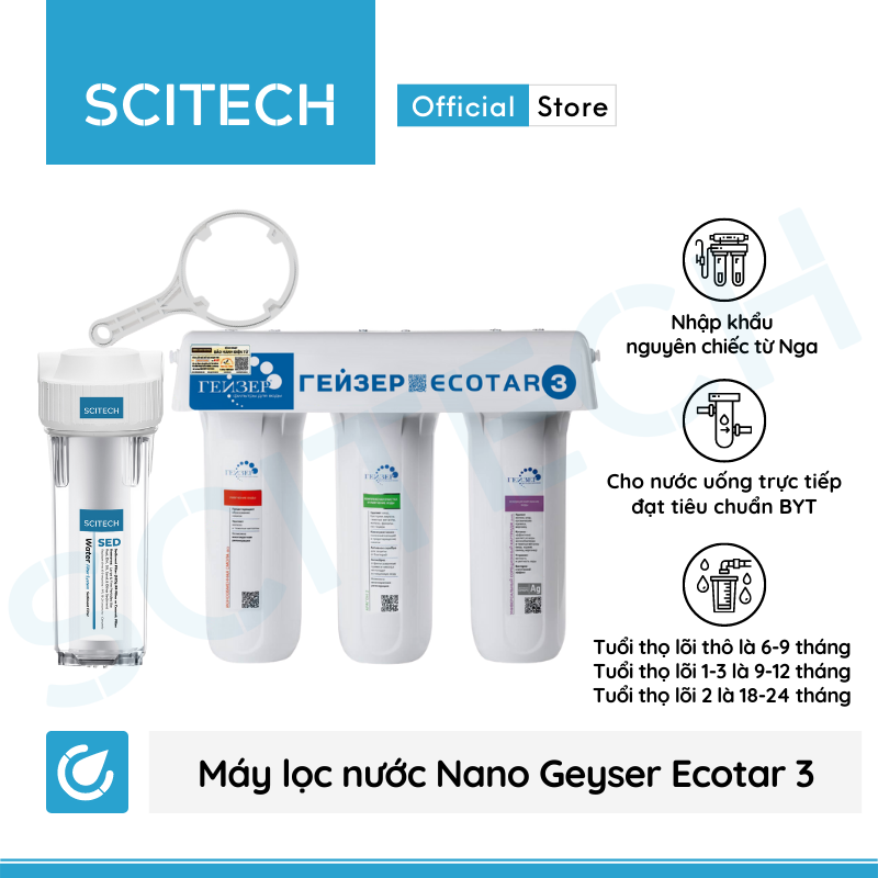 Thương hiệu: Nano Geyser Thời gian thay thế : LÕI 1 VÀ LÕI 2 LÀ 6 THÁNG, LÕI 3 LÀ 24 THÁNG Công nghệ: Nano Geyser Lõi PP.2IN1.GAC : Bông xốp PP có chức năng: Ngăn chặn bụi