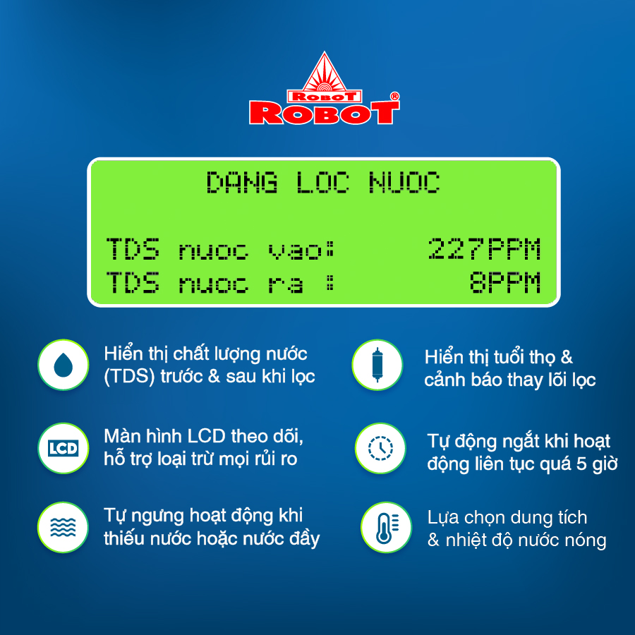 Duy trì mục tiêu lan tỏa nguồn nước tốt đến với cộng đồng, các sản phẩm từ nhà sản xuất ROBOT luôn ổn định với mức giá tối ưu và cùng nhiều chương trình ưu đãi, khuyến mãi trong năm mang đến lợi ích tối đa cho người dùng.