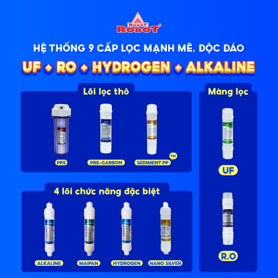 • Máy được tích hợp 2 công nghệ lọc tối ưu nhất hiện nay là UF (Ultrafiltration) & R.O (Reverse Osmosis) cho nguồn nước sau lọc sạch tối đa, được loại bỏ hoàn toàn cặn bẩn hay chất gây hại. Được trang bị thêm công nghệ vi điều khiển RMC-LCD thiết kế phát minh mới của ROBOT, hỗ trợ người dùng trực tiếp kiểm soát chất lượng nước trước & sau lọc, cảnh báo rủi ro trong quá trình sử dụng.   Với công nghệ “Bảo vệ 3 tầng”, máy lọc nước ROBOT được các chuyên gia đánh giá là sản phẩm bảo vệ tuyệt đối an toàn cho sức khỏe   Hệ thống đa cấp lọc mạnh mẽ của ROBOT ALPHA PRO 9GK-UR