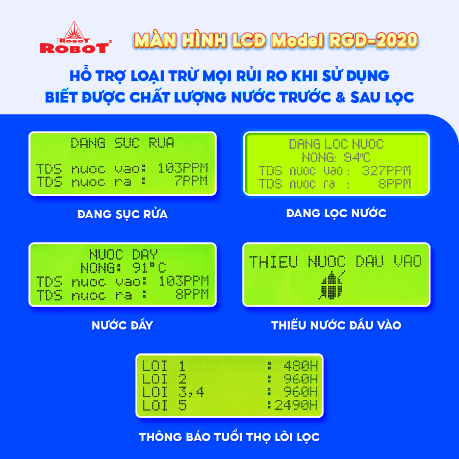 - Các sản phẩm máy lọc nước ROBOT đều sở hữu màn hình LCD sắc nét, hiển thị chi tiết các thông số TDS – chất lượng nước trước & sau lọc, tuổi thọ lõi lọc 24/24… để mọi người đều dễ dàng theo dõi hoạt động máy, chất lượng nước uống thông qua màn hình LCD, loại trừ mọi rủi ro, mang đến sự an toàn tuyệt đối khi sử dụng. 3. Kiểu dáng tinh tế, đa chức năng, tiện lợi