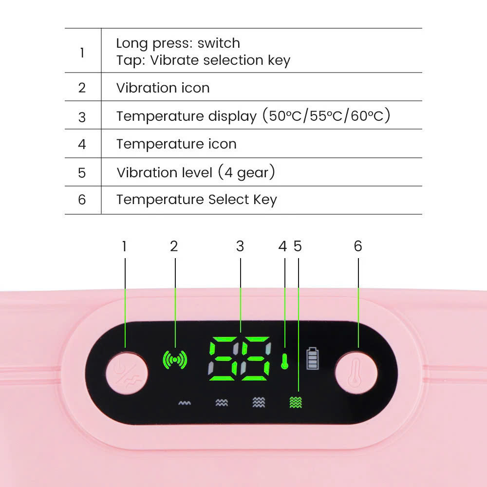Điều chỉnh nhiệt độ thông minh với 4 cấp độ (35-65℃) 5 chế độ rung Làm ấm nhanh, nhiệt độ nóng ổn định tạo cảm giác massage thoải mái. Không ồn Dây đai đàn hồi