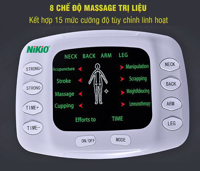 Máy matxa xung điện Nikio NK-105 được thiết kế 8 chế độ massage trị liệu và cho phép bạn thoải mái điều chỉnh cường độ xung điện lớn nhỏ theo 15 mức khác nhau. Bạn có thể điều chỉnh linh hoạt theo sở thích và các triệu chứng đau của mình, để có hiệu quả cải thiện tốt nhất.