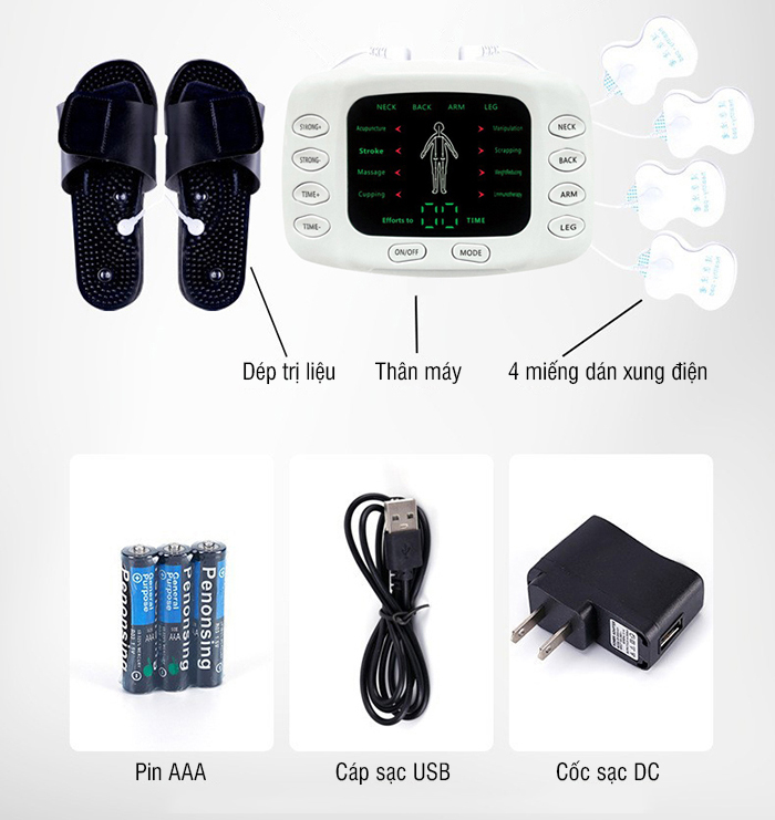 Máy massage xung điện 4 miếng dán và dép massage chân Nikio NK-105 vận hành bằng pin sạc hoặc 3 pin AAA. Máy sử dụng nguồn điện linh hoạt, tạo sự thuận tiện tuyệt đối cho người sử dụng.