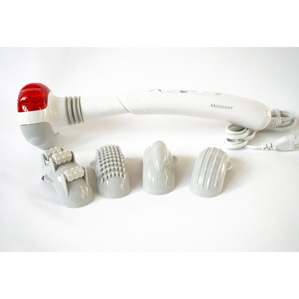 5 phần đính kèm: Năm phần đính kèm mát xa khác nhau được bao gồm trong máy mát xa cầm tay. Với điều này, các ứng dụng từ lĩnh vực bấm huyệt cũng như con lăn và xoa bóp điểm có thể được thực hiện