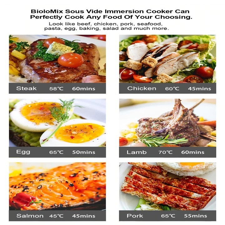 - Thiết bị đạt tiêu chuẩn chống nước cao IPX7, giúp an toàn khi sử dụng. Nấu ăn như một Cheef Pro – Bộ nấu ăn mới Biolomix Sous Vide SV-9008 mới cho phép bạn nấu một bữa ăn chất lượng như nhà hàng tại nhà. Bếp Sous Vide của chúng tôi là thiết bị nhà bếp hoàn hảo để nấu các loại rau, thịt và hơn thế nữa với khả năng kiểm soát nhiệt độ nấu nhất quán và chính xác. Tính năng hoàn hảo – Bảng điều khiển Hẹn giờ - Kỹ thuật số chính xác giúp nhiệt độ chính xác đến 0,1 ℃ và thời gian tính đến hàng phút. Phạm vi nhiệt độ đa dạng (Tối đa 90 ℃) và kiểm soát thời gian tối đa 99 giờ 59 phút cho phép bạn nấu bất kỳ loại thực phẩm nào bạn thích. Chế độ nấu bằng Sous vide ngăn chặn tối đa mất nước cần thiết và giữ lại nhiều chất dinh dưỡng và vitamin hơn so với các phương pháp nấu ăn khác. Dễ đáng sử dụng và vệ sinh – Chỉ cần gắn nồi vào bất kỳ nồi nào, thêm nước, cho các nguyên liệu của bạn vào túi hút chân không. Bắt đầu nấu chỉ với một nút bấm trên thiết bị. Chế độ hẹn giờ và kiểm soát nhiệt độ của nồi Sous vide cho phép bạn thư giãn trong khi nấu ăn, các phần tiếp xúc nước bằng thép không gỉ có thể tháo rời của bếp sous vide an toàn và vệ sinh dễ dàng, thiết bị nhà bếp này dễ dàng vệ sinh và bảo trì. Màn hình LCD lớn