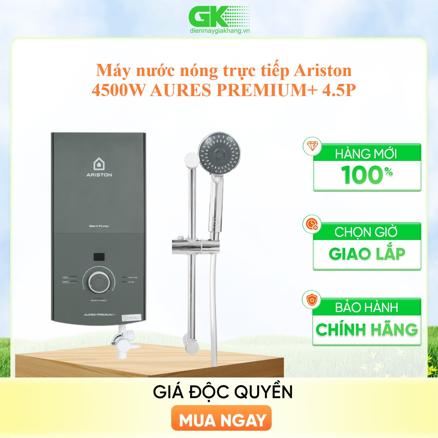 Máy nước nóng trực tiếp Ariston 4500W AURES PREMIUM+ 4.5P có vẻ ngoài thời thượng, gọn đẹp, làm nóng nước nhanh với công suất lớn 4500W, hỗ trợ công nghệ Residual Heat tự động giảm nhiệt dư, có bộ ổn định nhiệt kép, cầu dao chống rò điện ELCB, hệ thống an toàn đồng bộ TSS giúp tăng cường bảo vệ gia đình trong quá trình sử dụng máy tốt hơn.