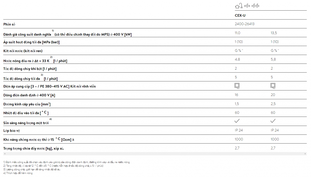 CEX-U với công nghệ điều khiển điện tử đảm bảo an toàn và tiết kiệm năng lượng. Nước nóng sẵn sàng sử dụng ngay sau vài giây kể từ khi mở van nước. Điều khiển
