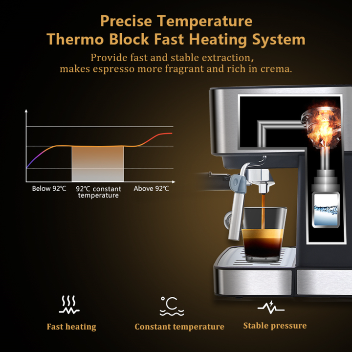 - Áp suất 20 bar tạo ra một ly Espresso với hương thơm đậm đà và lớp kem màu hạt ở trên.