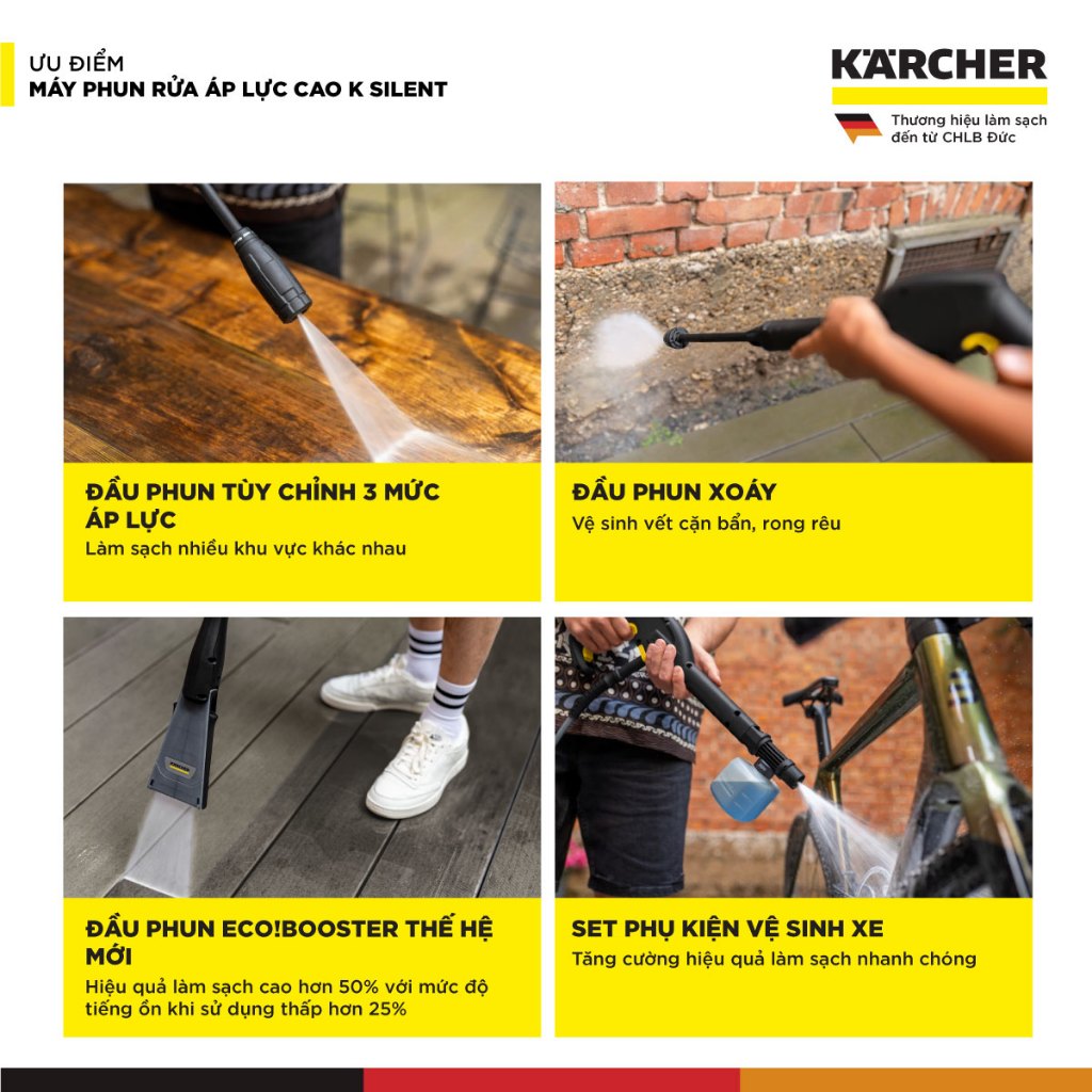 K Silent là máy rửa xe áp lực cao có công nghệ tiếng ồn thấp cải tiến giúp giảm 50% mức độ tiếng ồn khi so sánh với các máy phun rửa áp lực khác