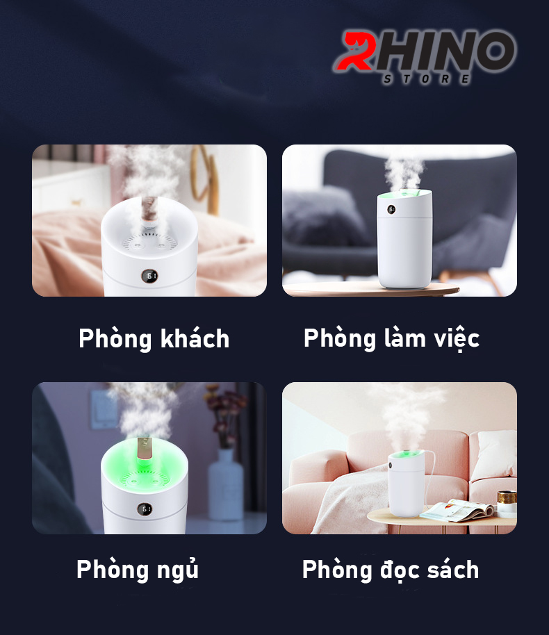 Máy phun sương Rhino H810 tạo ẩm, 2 đầu phun kèm đèn ngủ, 2 lõi phun tích hợp đèn, tiện lợi, dung tích lớn cho không gian rộng với ưu điểm 2