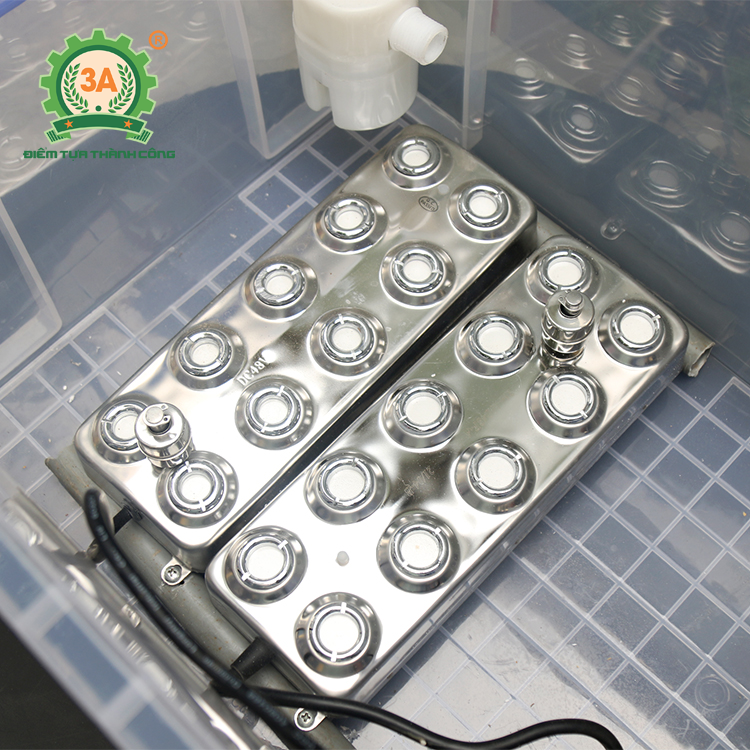 Máy phun sương tạo ẩm trồng đông trùng hạ thảo 3A510W được trang bị vỉ tạo ẩm siêu âm 20 mắt, giúp chuyển đổi dòng điện xoay chiều có tần số cực cao thành sóng siêu âm rồi phát ra bên ngoài bằng mắt tạo ẩm, công suất vỉ lên tới 250w. Do vậy, máy có thể tạo độ ẩm hiệu quả lên đến 99%. Ngoài ra, máy có khả năng tự bật máy khi ở độ ẩm dưới mức cho phép, tự ngắt máy khi độ ẩm đã đạt mức yêu cầu, nên vỉ sẽ không bị cháy, khuôn vỉ làm từ inox nên chống gỉ, chống nước siêu bền.