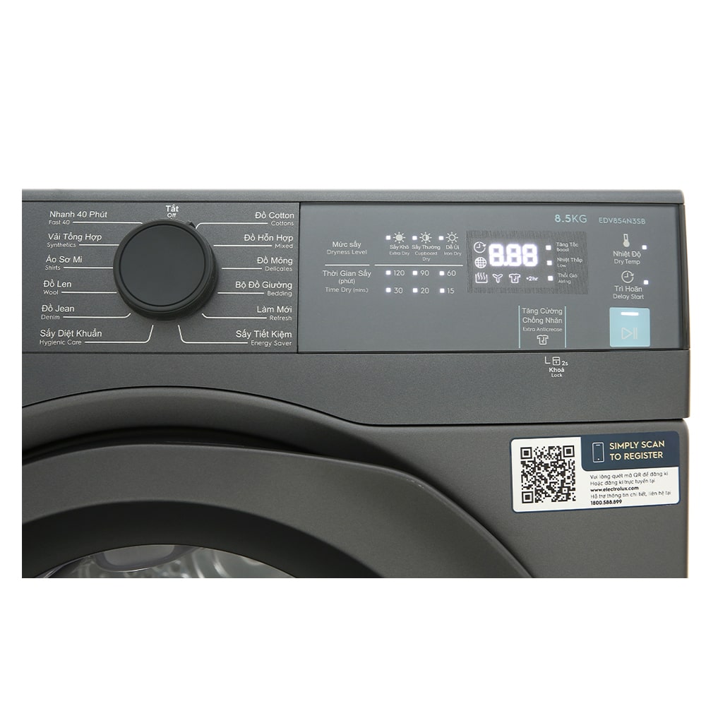 Máy sấy thông hơi Electrolux 8.5 kg EDV854N3SB với chế độ sấy diệt khuẩn Hygiene Care thích hợp cho những người có làn da nhạy cảm, cùng công nghệ cảm biến Smart Sensor hạn chế tình trạng quần áo bị nhăn, giảm thiểu thời gian là ủi,… đây sẽ là mẫu máy sấy thích hợp cho các gia đình có từ 3 – 5 thành viên