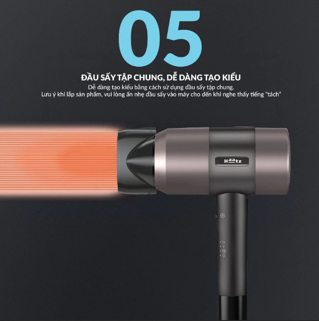 • Đầu sấy tập trung tạo luồng khí mạnh giúp tạo kiểu tóc dễ dàng