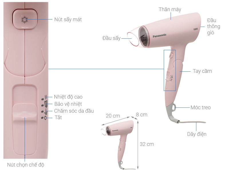 Máy sấy tóc Panasonic với thiết kế nhỏ gọn, dễ cầm nắm cùng công suất hoạt động mạnh mẽ 1800W giúp tóc nhanh khô, tiết kiệm thời gian sấy tóc Có 2 tốc độ sấy và chế độ sấy mát dễ dàng điều chỉnh qua nút gạt của máy Chế độ sấy mát tạo luồng gió mát làm khô tóc mỏng, yếu dễ dàng, bảo vệ chất tóc tối ưu. Bảo vệ da đầu và tóc nhờ chế độ chăm sóc da đầu và bảo vệ nhiệt Chế độ chăm sóc da đầu với nhiệt độ sấy khoảng 50°C giúp sấy khô tóc nhẹ nhàng. Còn chế độ bảo vệ nhiệt bảo đảm nhiệt độ của máy không quá nóng, làm hư tổn tóc và da đầu của bạn. Tay cầm máy sấy tóc có thể gấp gọn, tiện lợi, dễ dàng mang theo khi đi du lịch, công tác hoặc đơn giản là đặt gọn trên kệ tủ Máy sấy tóc trang bị móc treo tiện dụng, giúp bạn dễ dàng bảo quản sản phẩm Sử dụng máy sấy tóc an toàn: