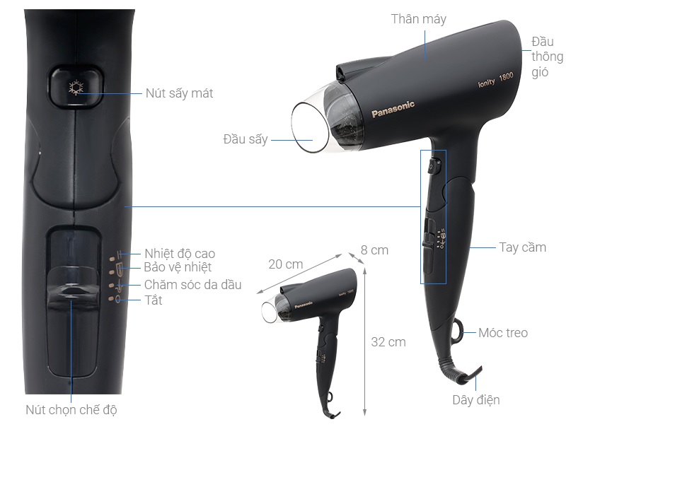 Máy sấy tóc Panasonic với thiết kế nhỏ gọn, dễ cầm nắm cùng công suất hoạt động mạnh mẽ 1800W giúp tóc nhanh khô, tiết kiệm thời gian sấy tóc Có 2 tốc độ