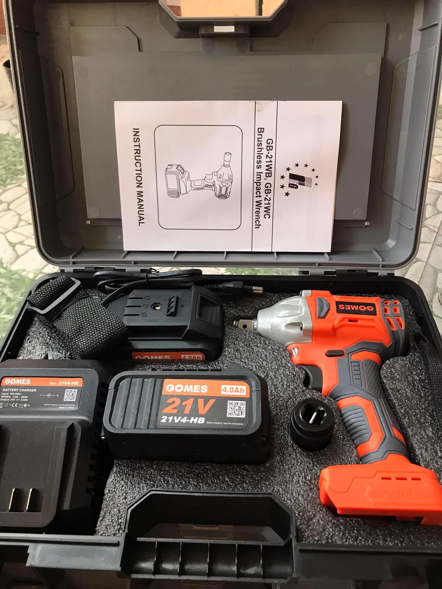 Thông số kĩ thuật -Mã sản phẩm: GB-21WB -Nhà sản xuất: GOMES -Xuất xứ: Trung Quốc -Loại máy Dùng pin -Tốc độ không tải 210 vòng/phút, 0 - 2.500 vòng/phút -Điện thế pin 21V -Loại Pin Lion 21V/4.0Ah -Đầu siết 1/2 inch -Lực siết tối đa 300Nm